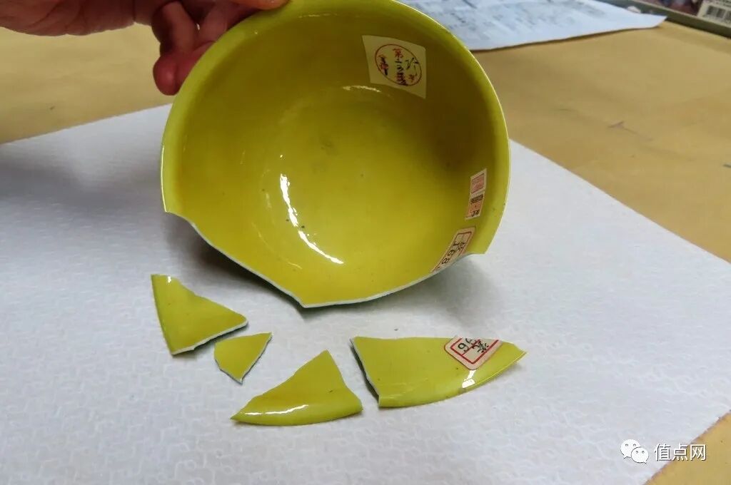 馆方证实三器分别为「明 弘治款 娇黄绿彩双龙小碗」、「清 康熙款 暗龙白里小黄瓷碗」、「清乾隆 青花花卉盘」。前两者疑于搬运期间碰撞而损毁,后者则因人为疏忽而从1米高的工作台掉落地面而摔破。