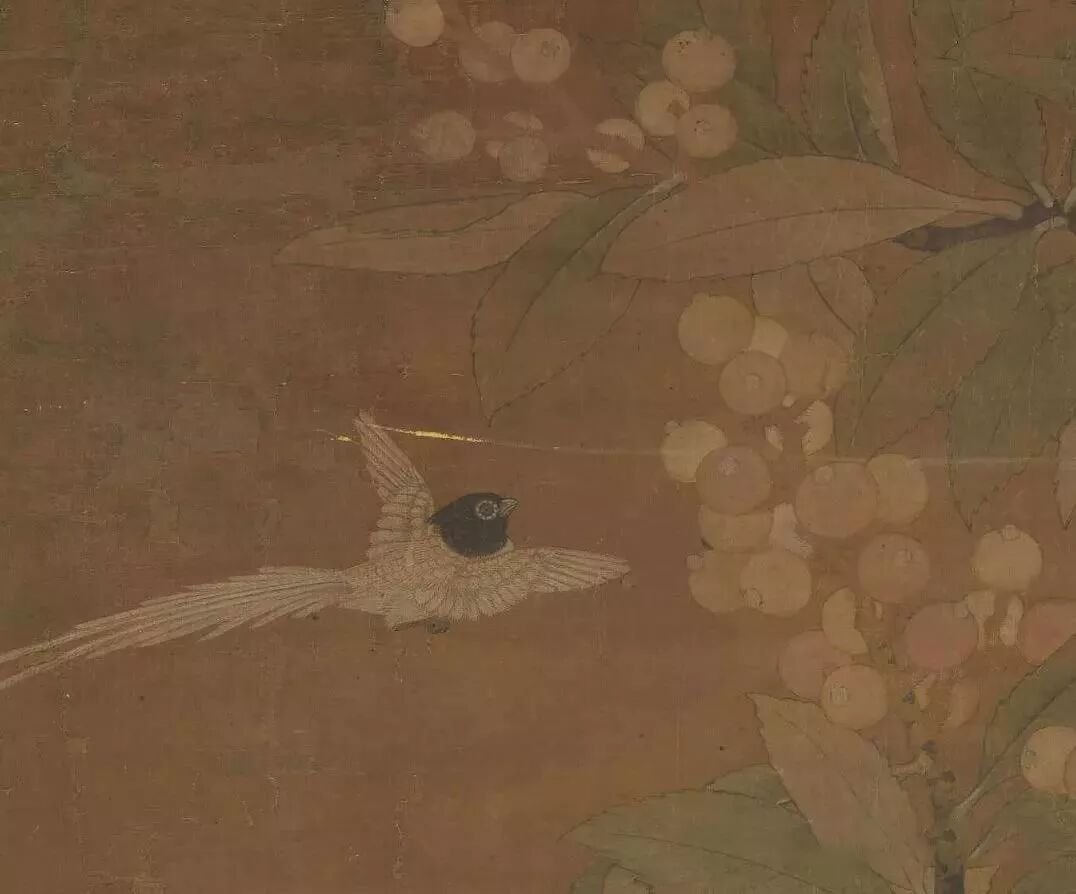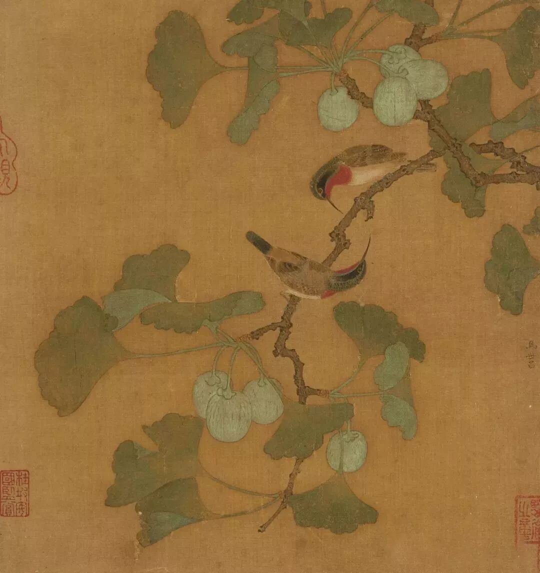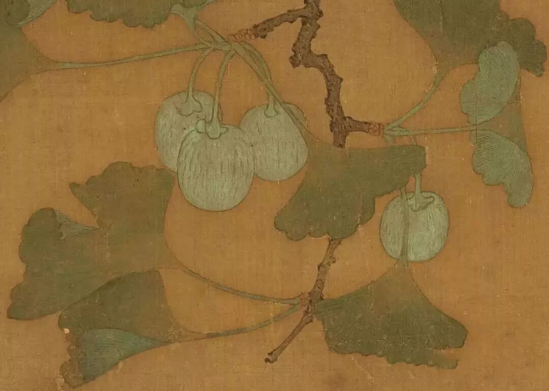 银杏的果实与枝叶,殆以石绿搭配汁绿填染,益发衬托出翎毛鲜艳华丽的身形。叶片的钩筋与转折,用笔极见细腻生动,反映了宋代画家审慎观物的创作态度。