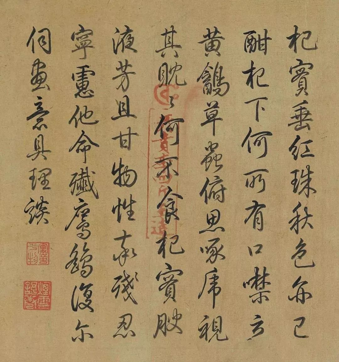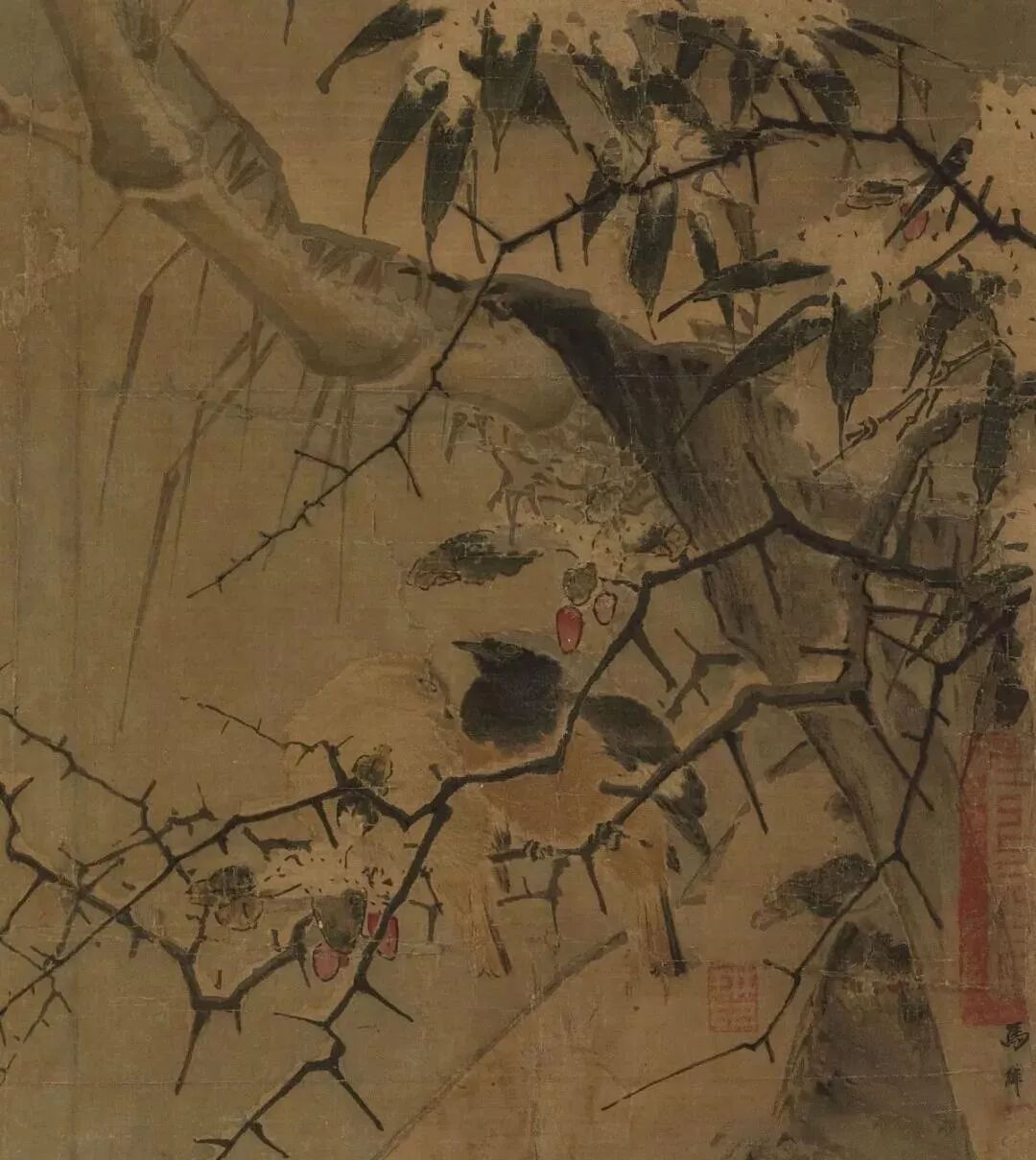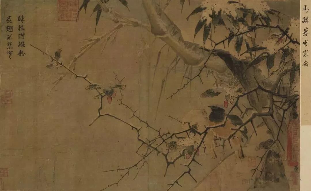 积雪处兼用留白与染粉法,映衬着红色的果实,与黄色的鸟羽,平添暖意与活泼生意。荆枝的线条转折处多呈锐角,俨然带有马远拖枝的笔意。左上方题句则出自宋宁宗,书画交相辉映,益觉画中有诗。