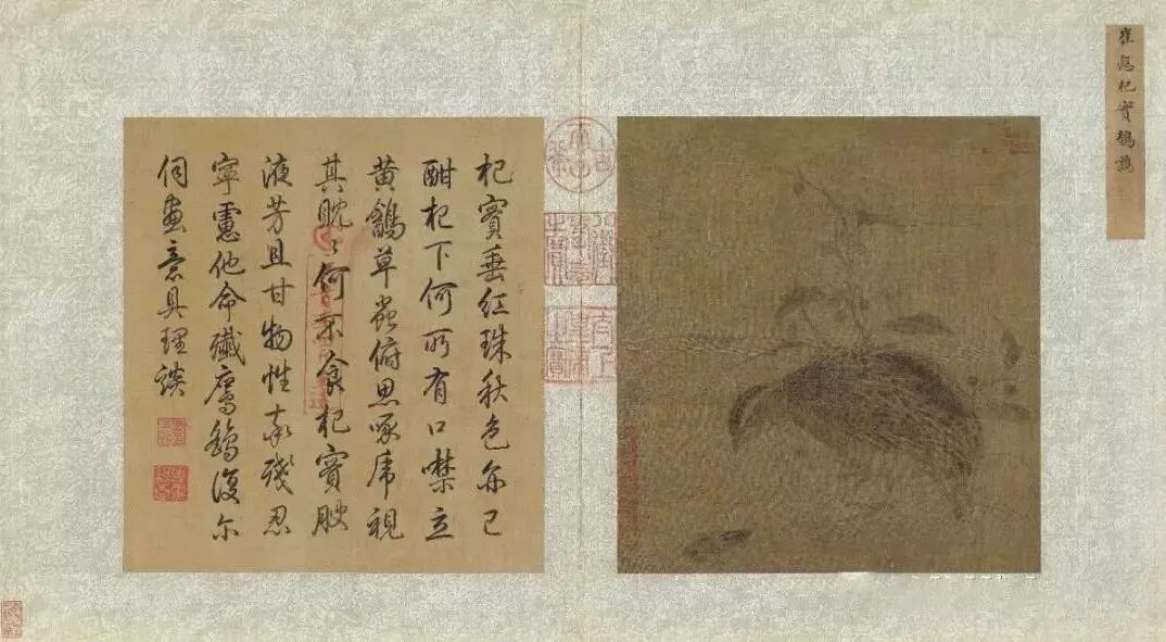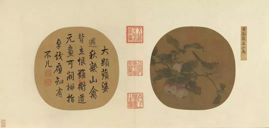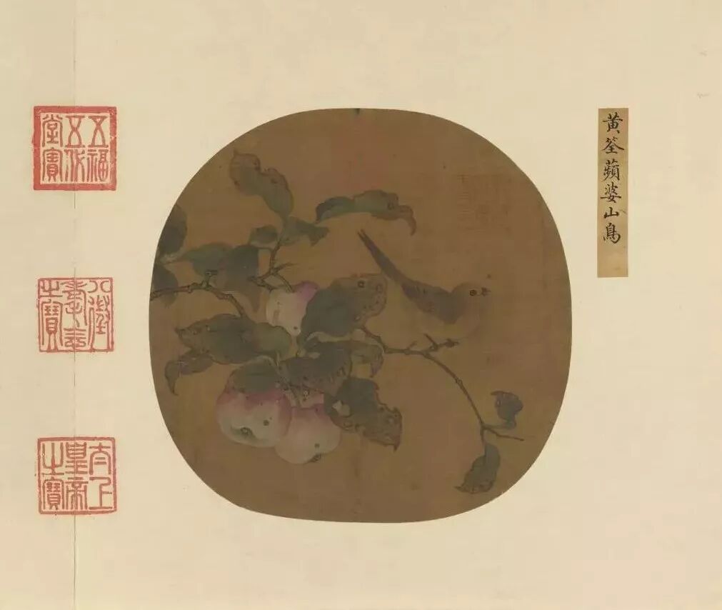 本幅收在《艺苑藏真》册。右方籤题,注明作者是北宋初年的 黄筌(约903-965),不过依据画风研判,作品时代应该更近于南宋的院体画。画面构图与北京故宫藏南宋 林椿(1174 -1189)的方幅《果熟来禽》酷似,反映出宋代画院经常会出现“一稿多本”的现象。