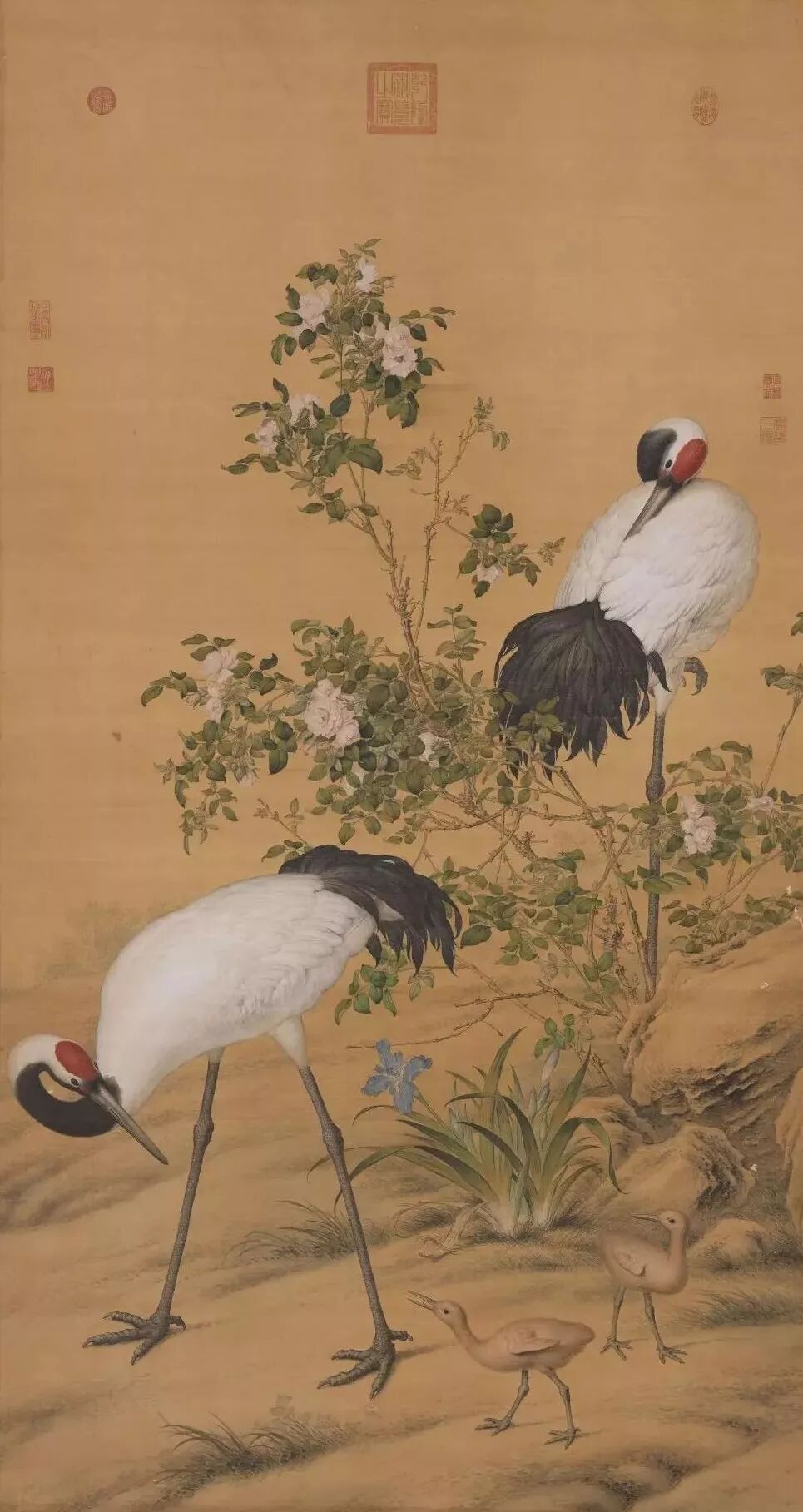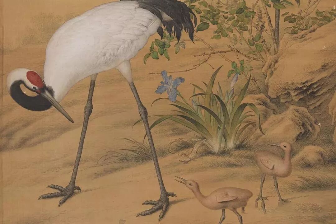 本幅画一对丹顶鹤陪伴着两只羽翼未丰的雏鹤,漫步于花丛间。鹤的姿态和羽翼,描绘得栩栩如生,毛色并浮现出光泽。这样的拟真画法,同样运用于画中植物,如蔷薇和鸢尾花,均有极细腻的描绘。