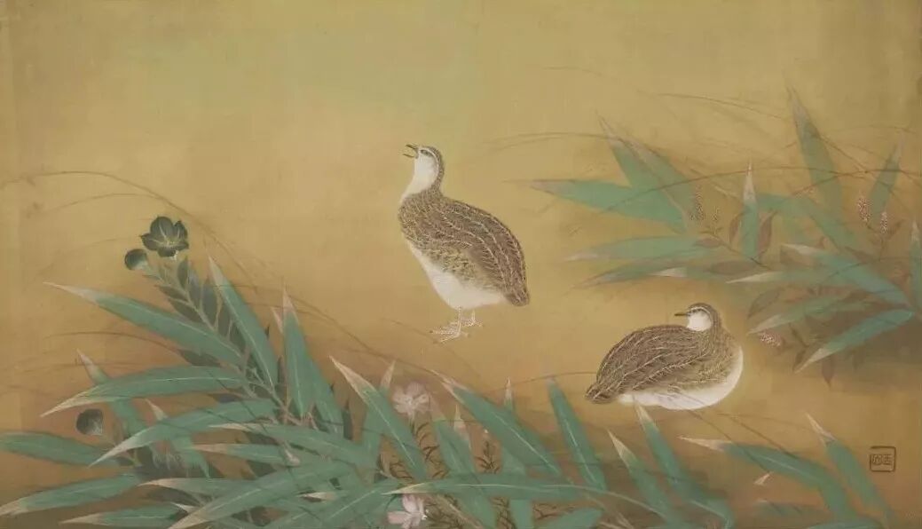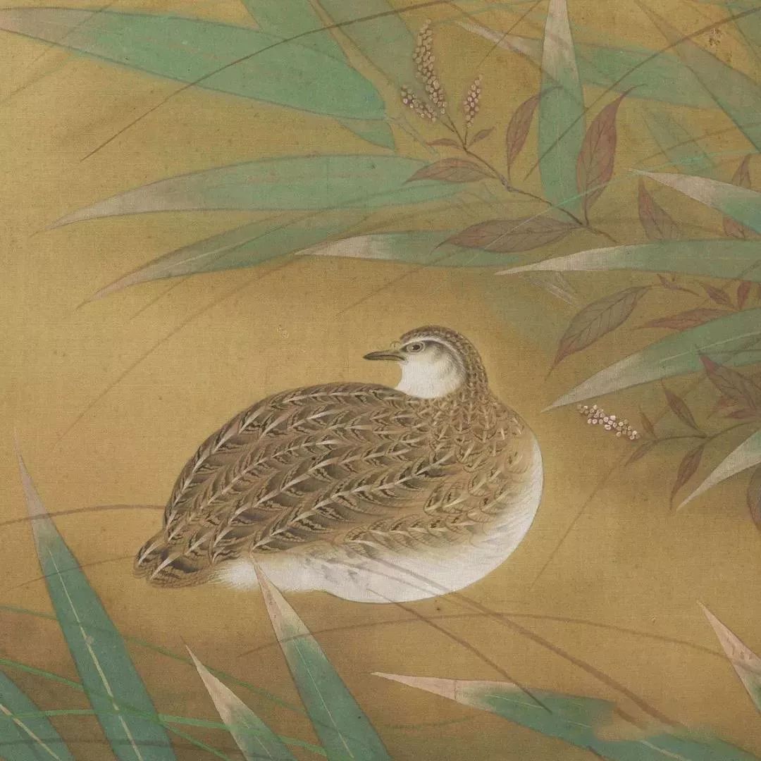 通幅以勾勒填彩法,画一立一卧两只鹌鹑,周围伴生着绿竹、石竹、桔梗等草花。禽鸟与植物,形象真实,鹌鹑身上的羽毛,钩染尤其细腻生动,洋溢著宛如宋画般典丽秀雅的风致。