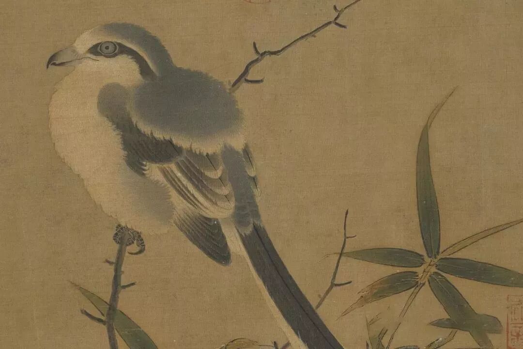 伯劳与翠竹採用双钩填染法,线描细劲而赋彩温润,将鸟羽蓬松的质感,刻划得极为传神。棘枝则用没骨法,于追求形似之外,亦带有写意的笔调。类此既精准又富变化的手法,确实是两宋画院过渡时期的典型风格。