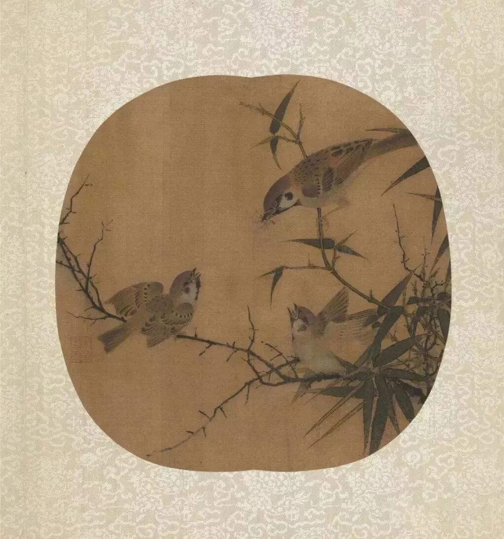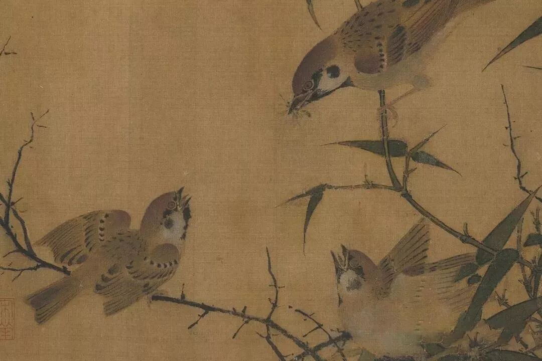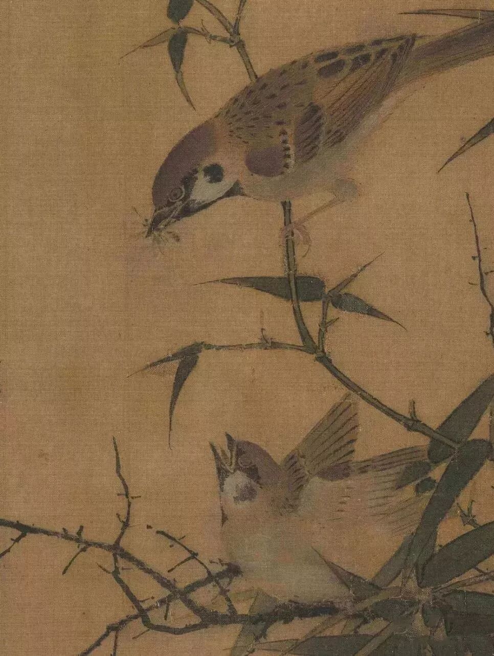 本幅选自《宋人集绘》册,无作者名款。原本为纨扇,后来改装成册页形式。画三只麻雀,一母二子。母鸟口中衔着刚捕获的小虫,将将飞至,两只幼雀则张口振翅,嗷嗷待哺。竹树和荆枝的线描极见挺劲,并由于鸟儿的停驻,彷彿随之上下摆荡。