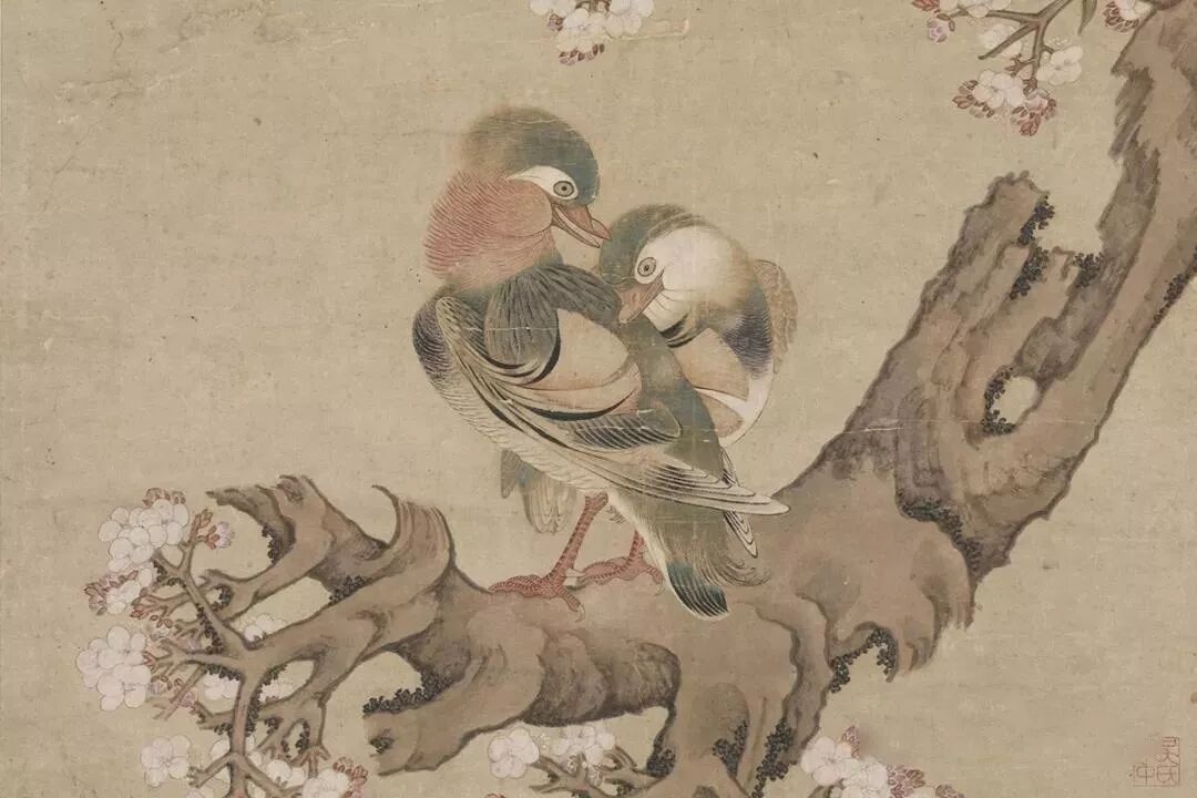 本幅画杏树的老干自右侧斜出,一对鸳鸯相互依偎并立于枝上,情意俱足。树干虽已蚀空,枝蕊却依旧繁茂茁壮。上方另画细枝上挑,树梢断折处,吴彬的款印即暗藏于其间。