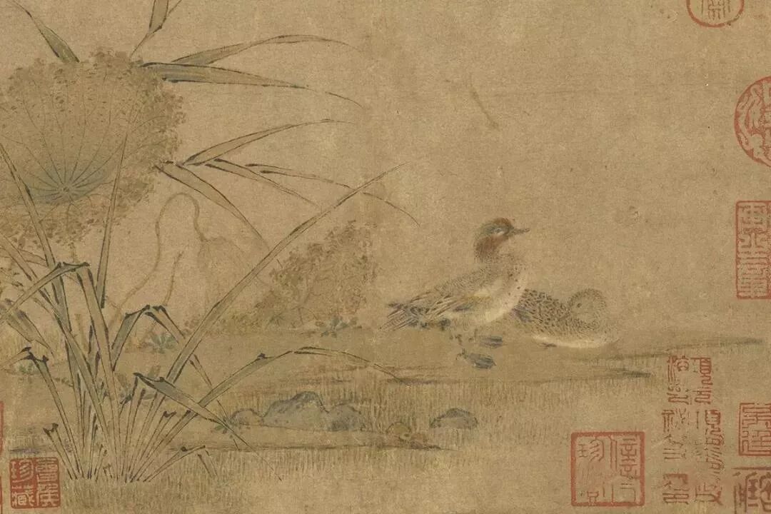 小水鸭的羽毛以细笔点簇,将蓬松感表露无遗。而墨笔勾勒的芦苇,则和用没骨法表现的荷叶,互成劲拔与秀润的对比。虽然无法肯定是惠崇真迹,仍不失为一件耐人寻味的宋代小品杰作。