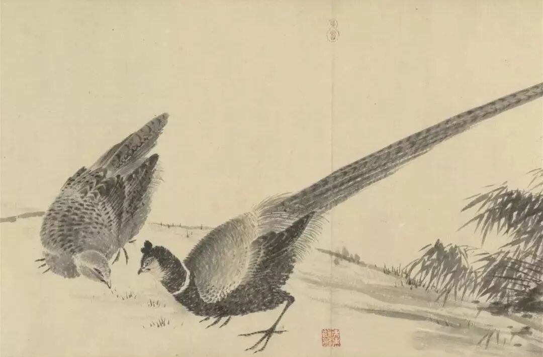 本幅选自《名画集真》册,右下角有马麟款印。画寒冬暮雪,山壁间延伸出枸杞荆棘与翠竹,一对黄尾鸲栖息于荆枝上,相互依偎着取暖。