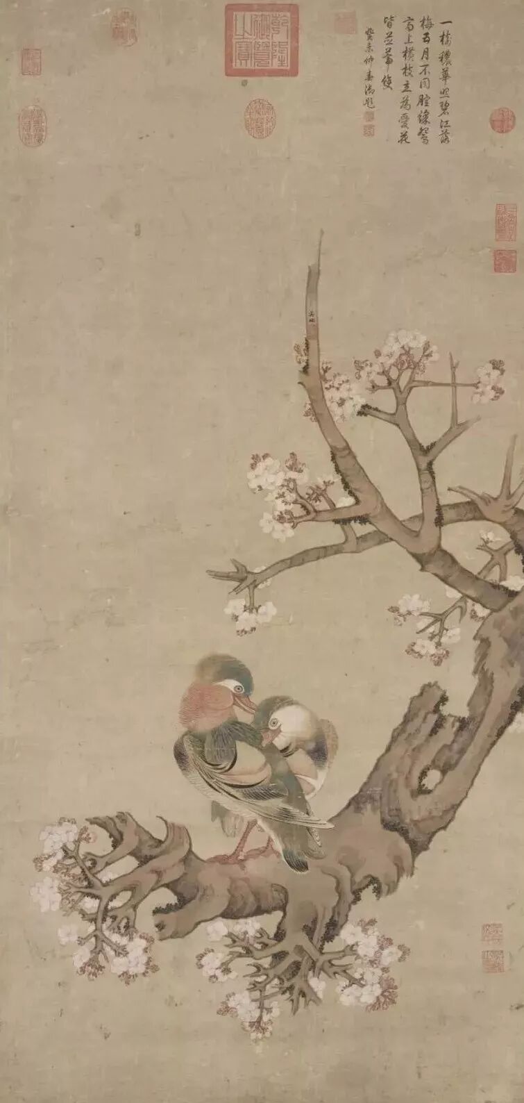 鸳鸯本为水鸟,甚少画成栖枝之景,此作无论布局、立意均甚奇谲,加以笔墨细谨而设色古雅,凸显了画家与众不同的个人风格。
