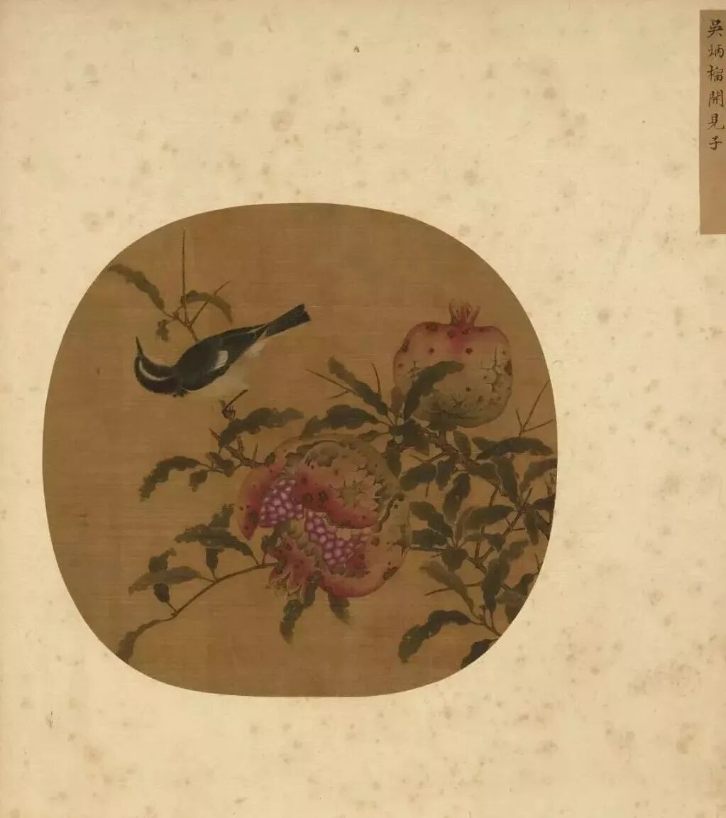 本幅收在《宋元集绘》册,右方叶隙间藏有吴炳款。在纨扇形的格局中,画石榴枝上结着两枚业已熟透的果实,爆开的那枚,还可看见里面嫣红色的浆果。枝梢,停驻了一只白眉鶲,探身回首的模样,姿态极为轻盈婉约。中国常借石榴来象征圆满、丰盛与多子多孙,所以此作于展现自然生态之外,也蕴含有祝愿吉祥的寓意。
