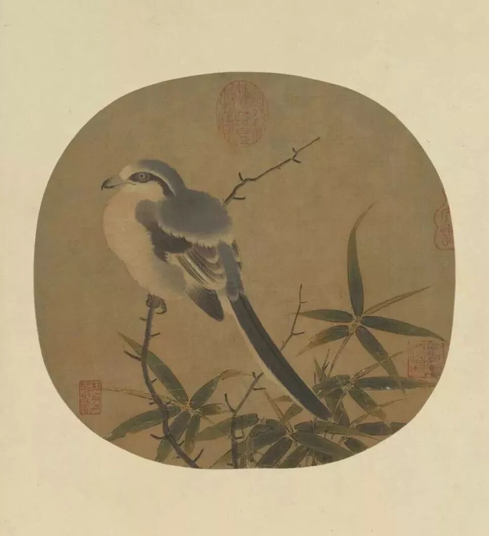 本幅收在《纨扇画册》,旧题为竹鸠,但此画中的禽鸟其实应是楔尾伯劳。右下方竹叶间,有小字款署“武经郎李安忠画”。