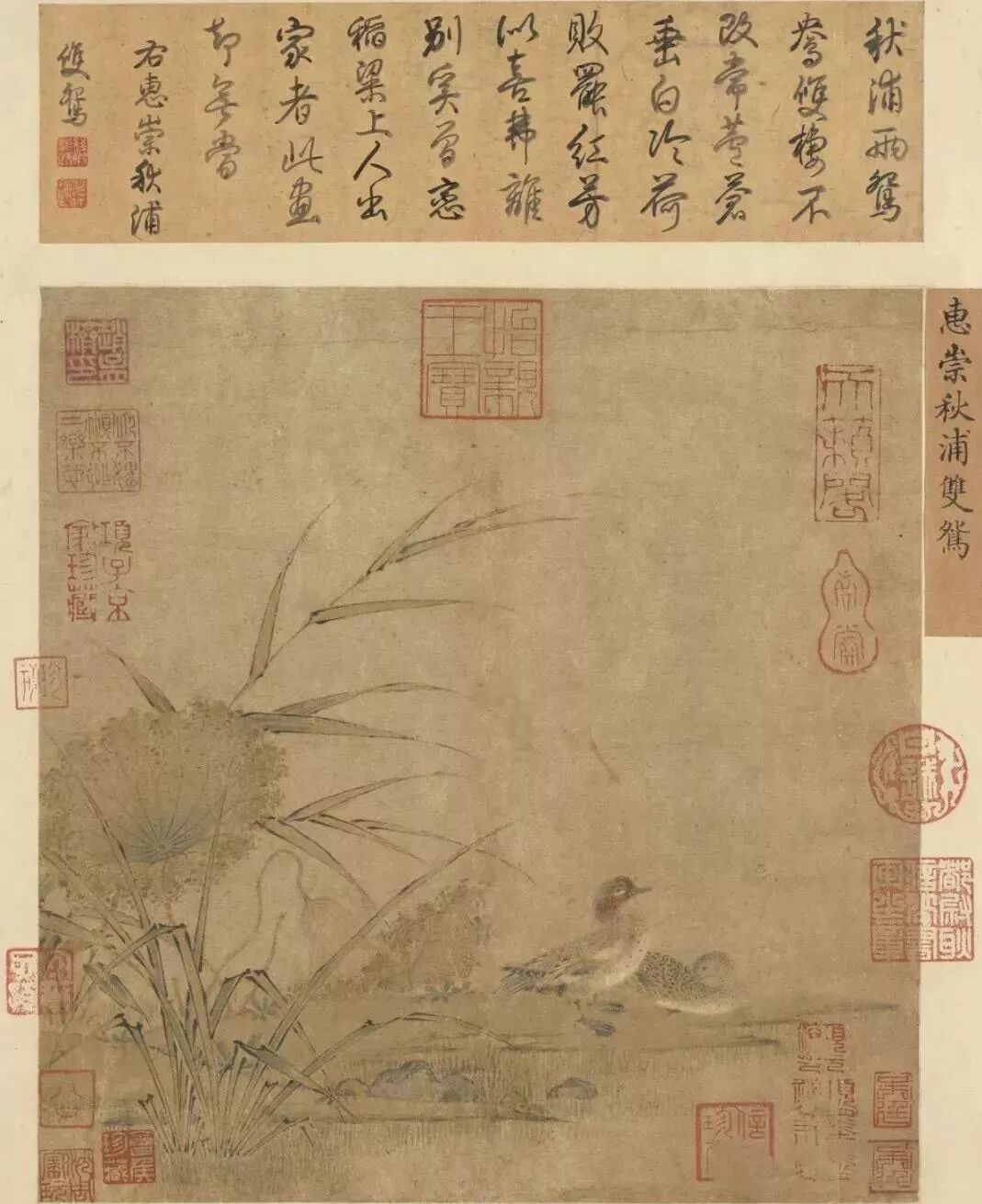 本幅选自《历朝画幅集册》,描绘一对小水鸭(原题误为鸳鸯)驻足在河岸边歇息。画家透过枯萎的荷叶与芦苇,点出初秋的时节,淡雅的设色,更为画面平添萧瑟宁静的气息。