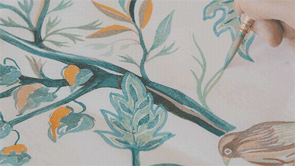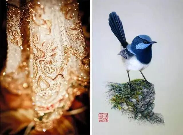 从下图中可以看出,服装上的图案画法确实与我们传统的《花鸟图》非常相似,甚至鸟儿的翅膀羽毛笔触也都很接近: