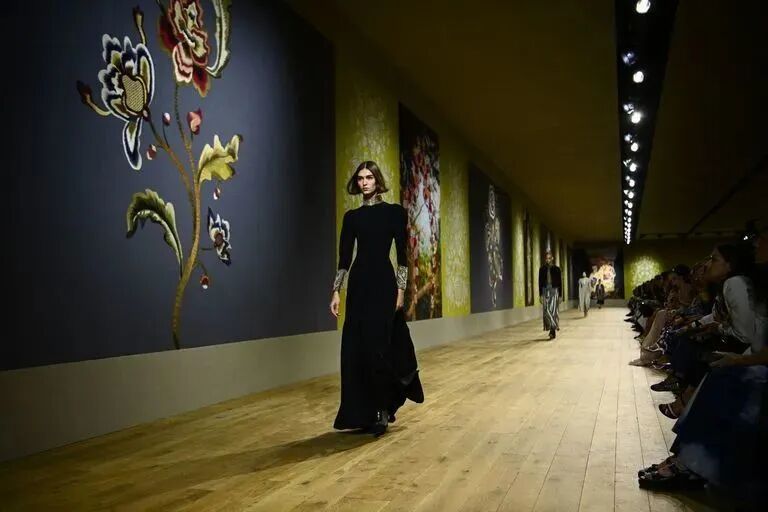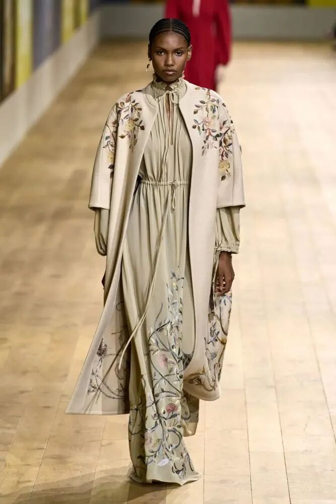 据介绍,「生命之树」是这一季 DIOR 女装创意总监 Maria Grazia Chiuri 创作的灵感之源。源自于她在罗马当代艺术博物馆 Maxxi 中见到了乌克兰艺术家 Olesia Trofymenko 的一幅画萌生的想法,并将那些附有神秘色彩的古老元素通过绘画创作和刺绣工艺呈现在了 DIOR 高级订制服上。