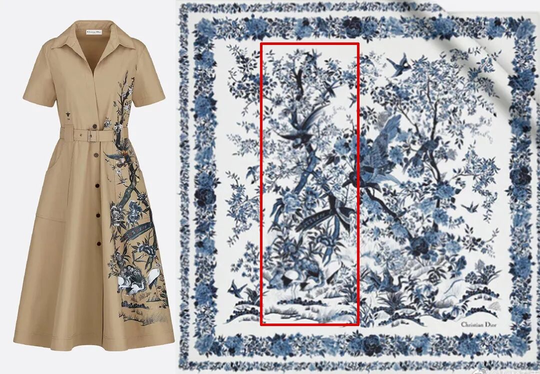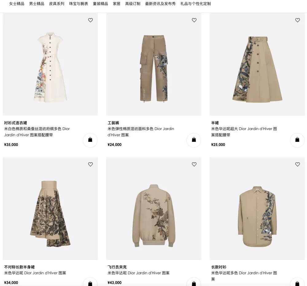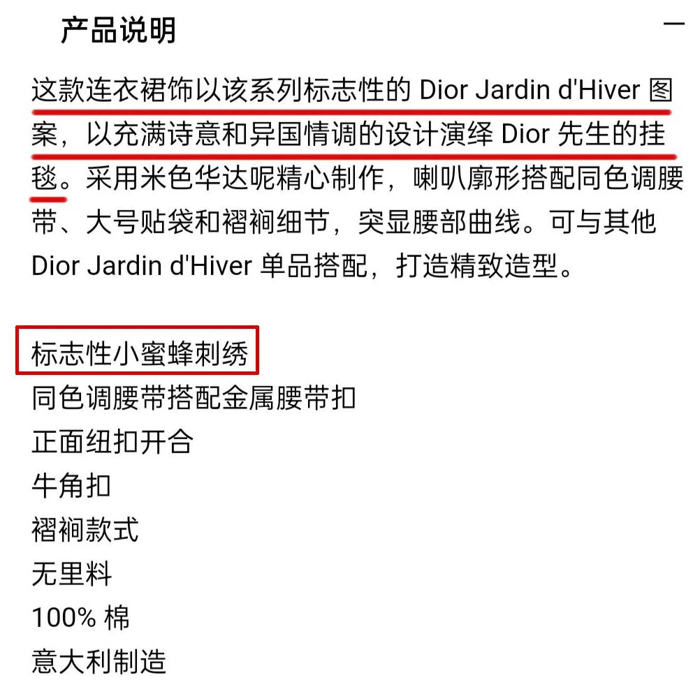 与马面裙事件相似的是,迪奥官网的产品介绍中并没有提到《花鸟图》,而是称其为该系列的标志性Jardin d'Hiver(冬日花园)图案。商品说明页面介绍,此系列时装以充满诗意和异国情调的设计演绎 Dior 先生的挂毯。