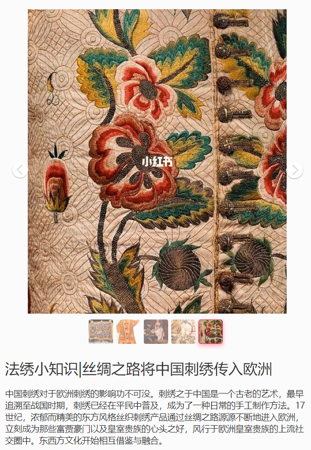 可能很多人认为这会不会也是运用的中国传统工艺——刺绣,小优也特意去查了一下,确实中国刺绣对于欧洲刺绣的影响功不可没。17世纪,浓郁而精美的东方风格丝织刺绣产品通过丝绸之路源源不断地进入欧洲,成为那些富贾豪门以及皇室贵族的心头之好,风行于欧洲皇室贵族的上流社交圈中。东西方文化开始相互借鉴与融合。