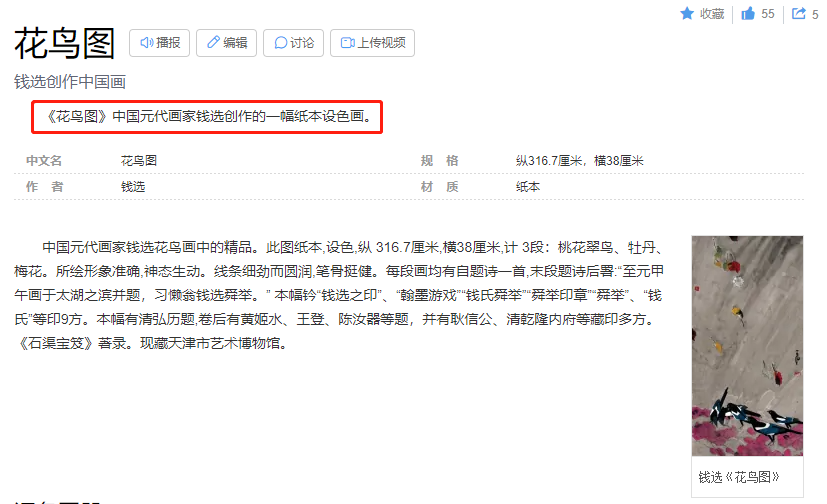 花鸟图是中国元代画家钱选创作的一种纸本设色画。是指用中国的笔墨和宣纸等传统工具,以“花、鸟、虫、鱼、兽”等动植物形象为描绘对象的一种绘画。
