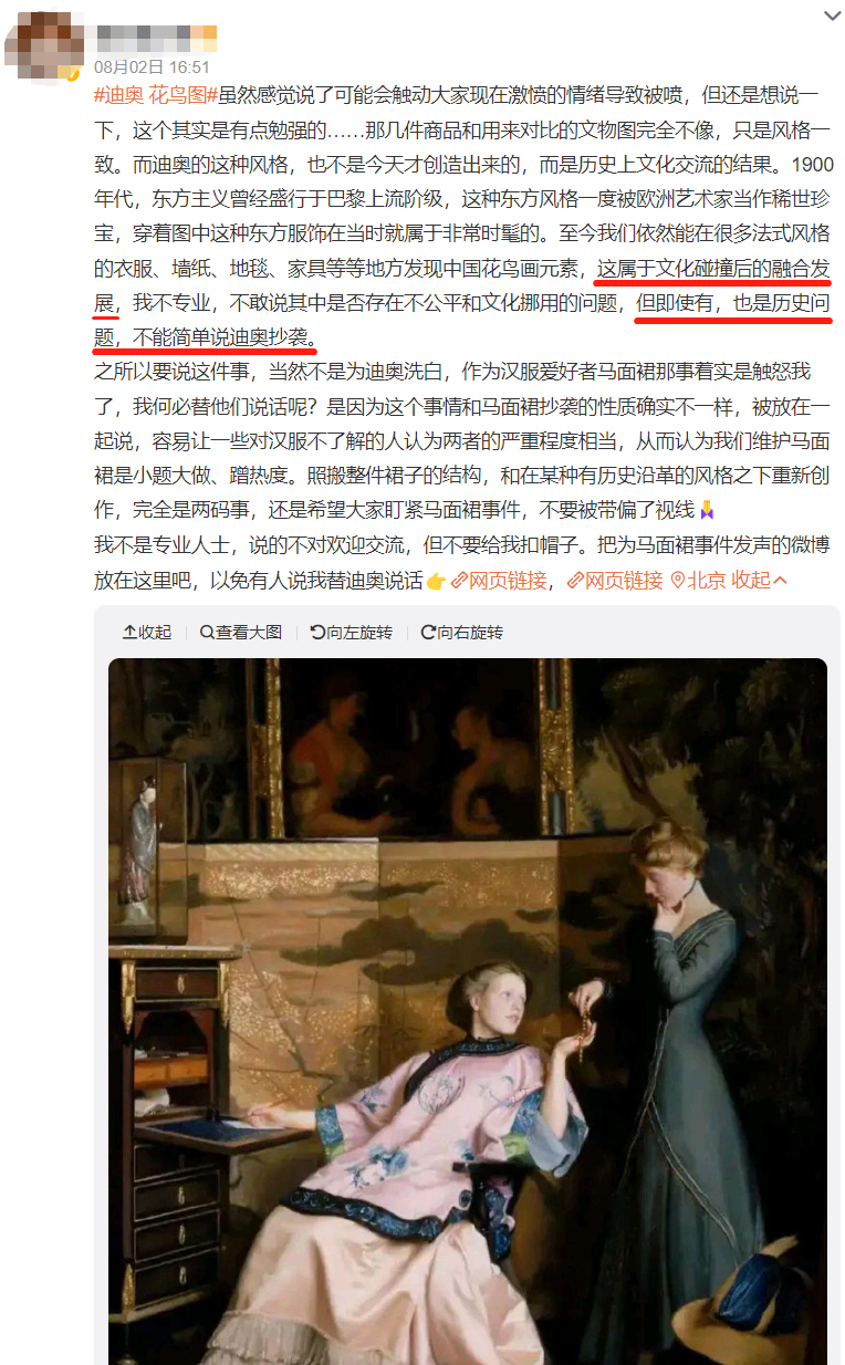 有网友认为,这只能属于文化碰撞后融合发展,是历史问题,不能简单的说是迪奥抄袭,只有马面裙才是真正的抄袭。