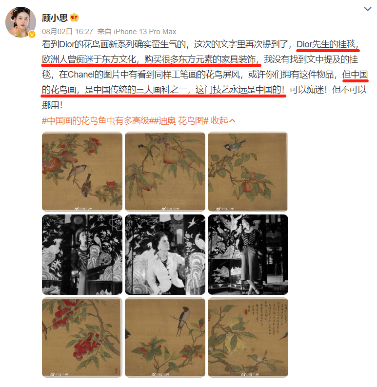 最后,对于此次迪奥挪用花鸟图事件,你怎么看?欢迎在评论区一起聊一聊吧!