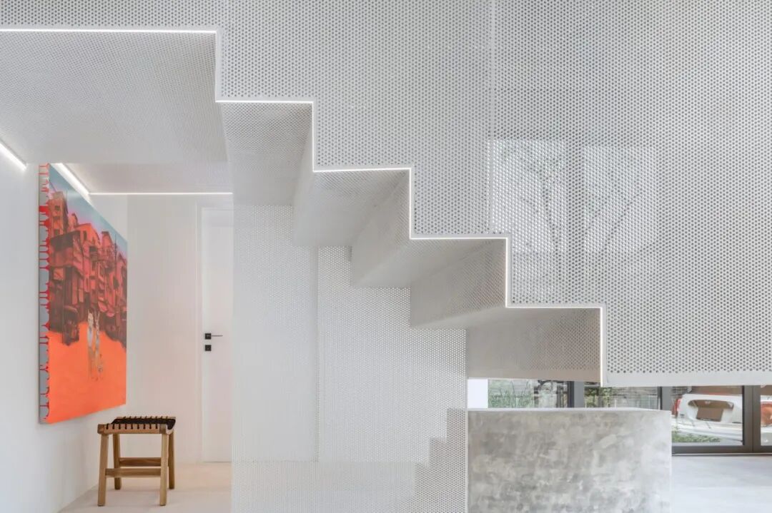 The perforated steel sheet staircase is located in the center of the house as a sculpture.
