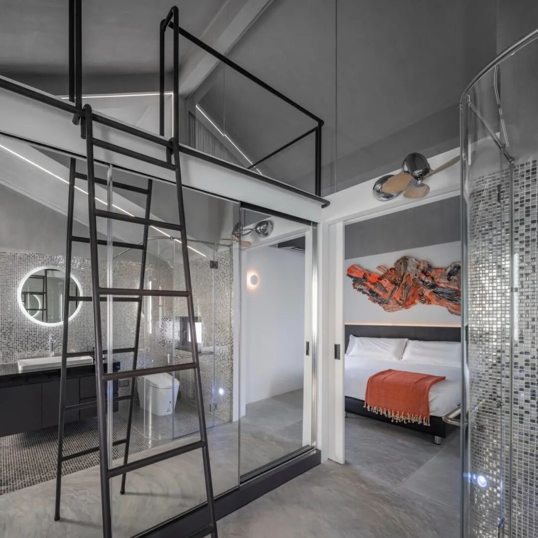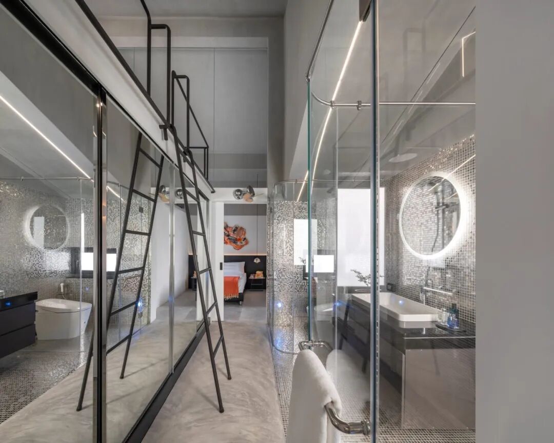 设计师将卧室位置规划在办公室的对面,可提供不同的外部景观,同时通过更衣室和浴室保持连接。在更衣室和浴室的上方是一个放松区,可以用来瑜伽或冥想。