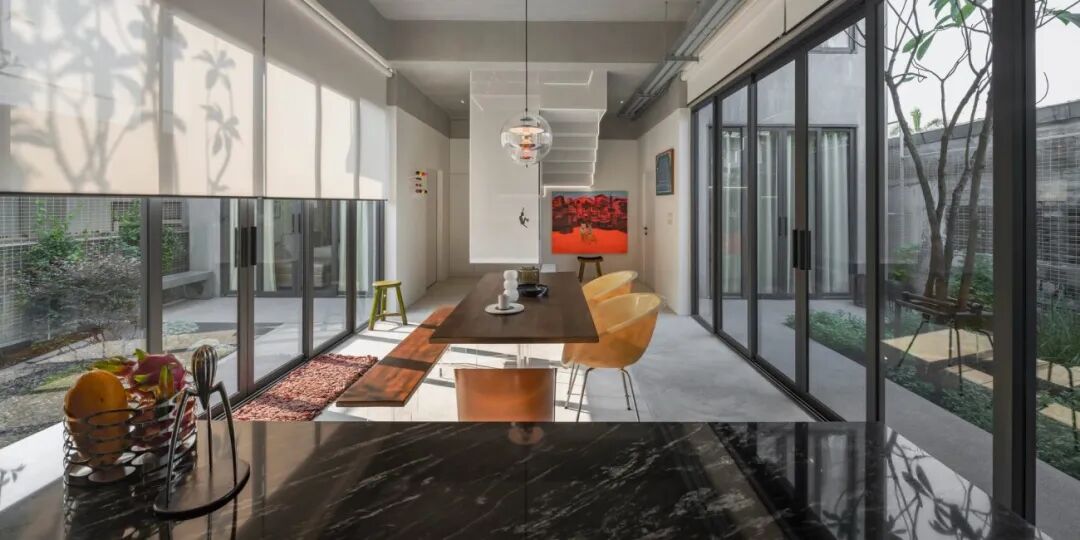 当打开靠近小花园两侧的餐厅门时,自然光和风随着微风流动,创造了一个轻松、休憩和社交的理想氛围。