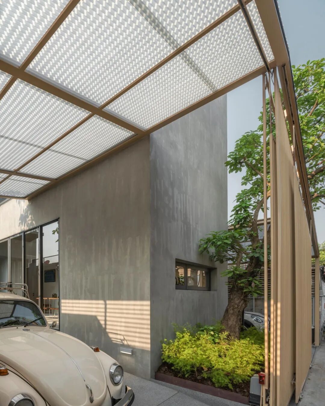 建筑的整体设计使用了简单的材料和颜色,使建筑看起来更简洁。设计师选择了露出原有的混凝土建筑表皮不进行粉刷,并设计了深灰色的门框。为了使住宅功能更完整,设计了车棚的屋顶和入口的围栏,形成了一种协调而不疏远周围环境的延续。此外,选择的栅栏板条有助于停车区域的通风,并与房屋的主体形成鲜明对比。
