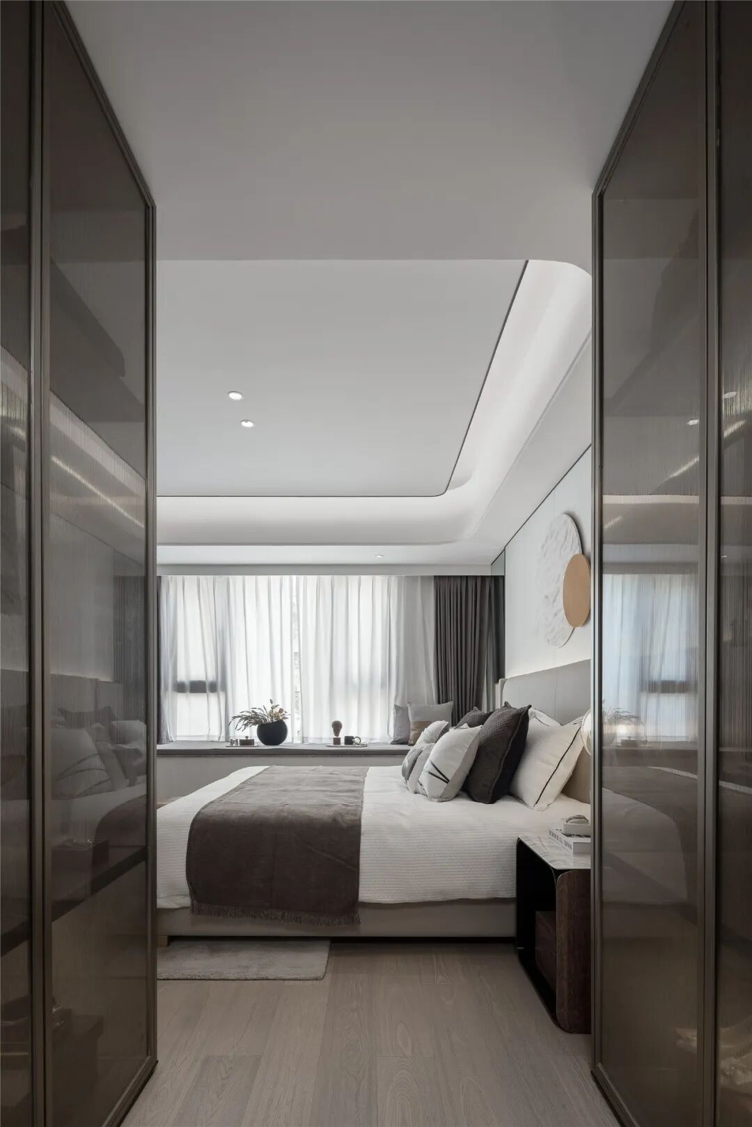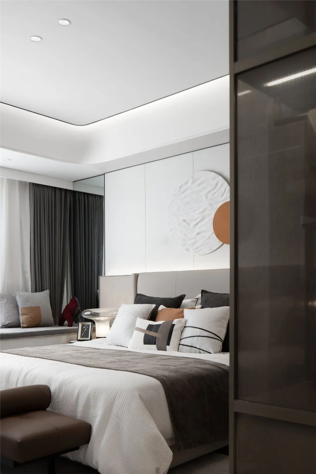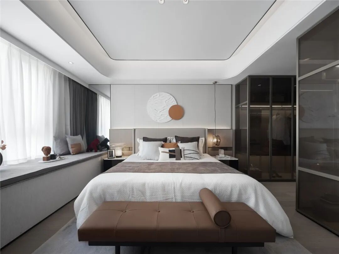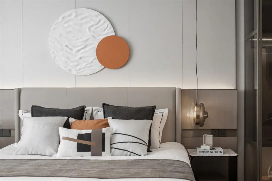 主卧以沉静温暖的色调营造宁静柔和的空间气质,烟波浩渺的海面冉冉升起一轮圆月,勾勒“月下休憩”的诗意。大面积飘窗延伸空间的更多可能,阅读、发呆、静静欣赏窗外的风景……多种美好在此发生。