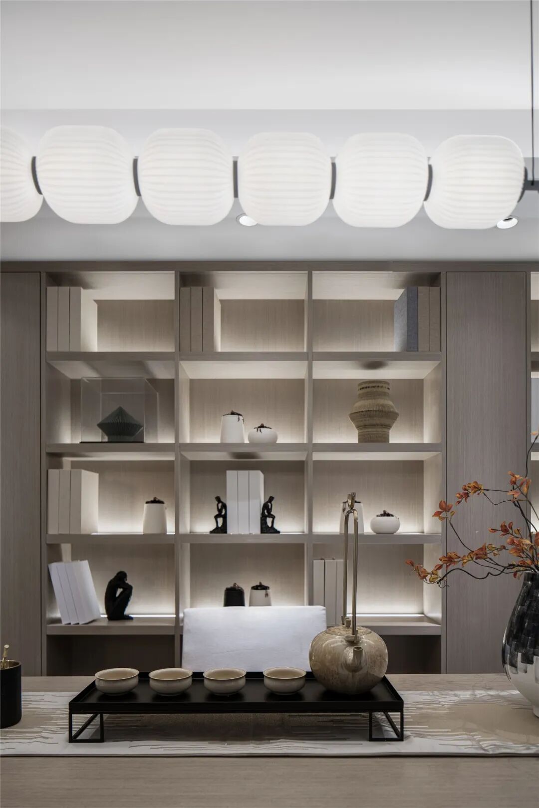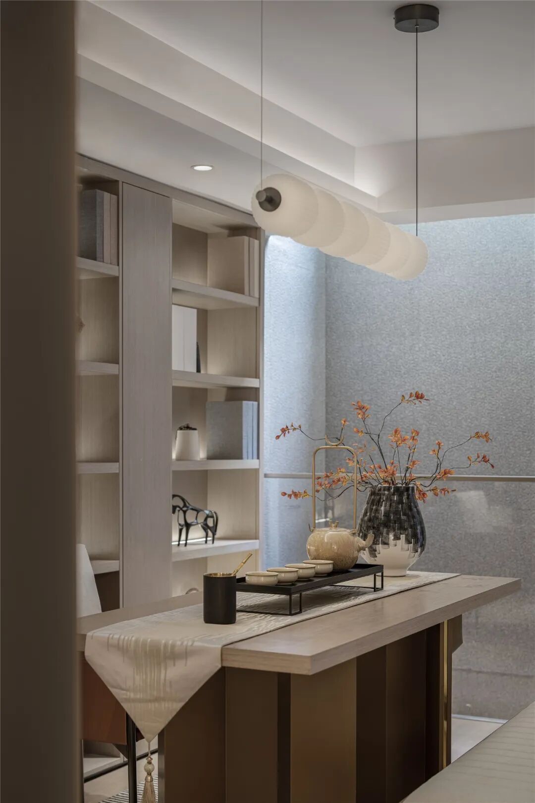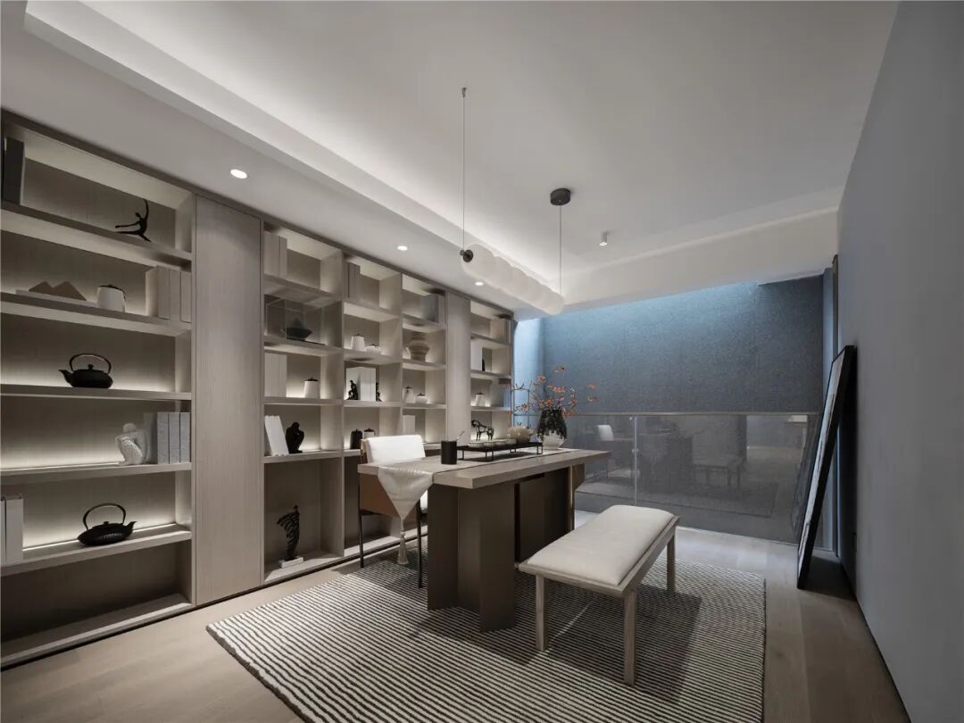 夹层书房,设计师特意选用木、瓷、纸等东方美学元素点缀空间,居者可在此静心品茗赏味、恣意挥洒笔墨、或自在把弄古玩。沉浸式场景打造,赋予空间文人雅士般的气质,静享生活的淡泊与宁静。
