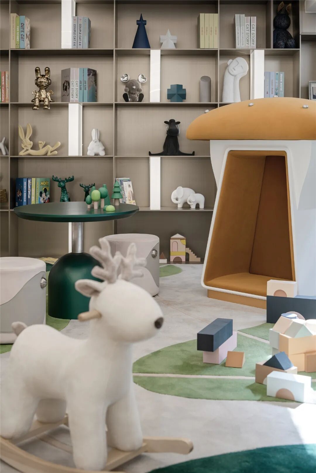 夹层游乐区以多彩的颜色与可爱的动物摆件、儿童玩具打造一座“森林蘑菇屋”,满足孩子们的童心与好奇。