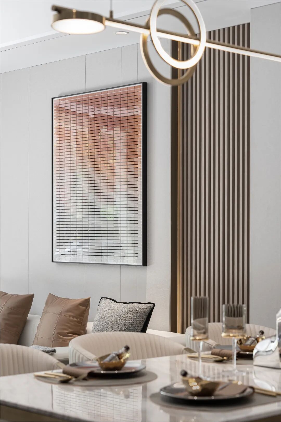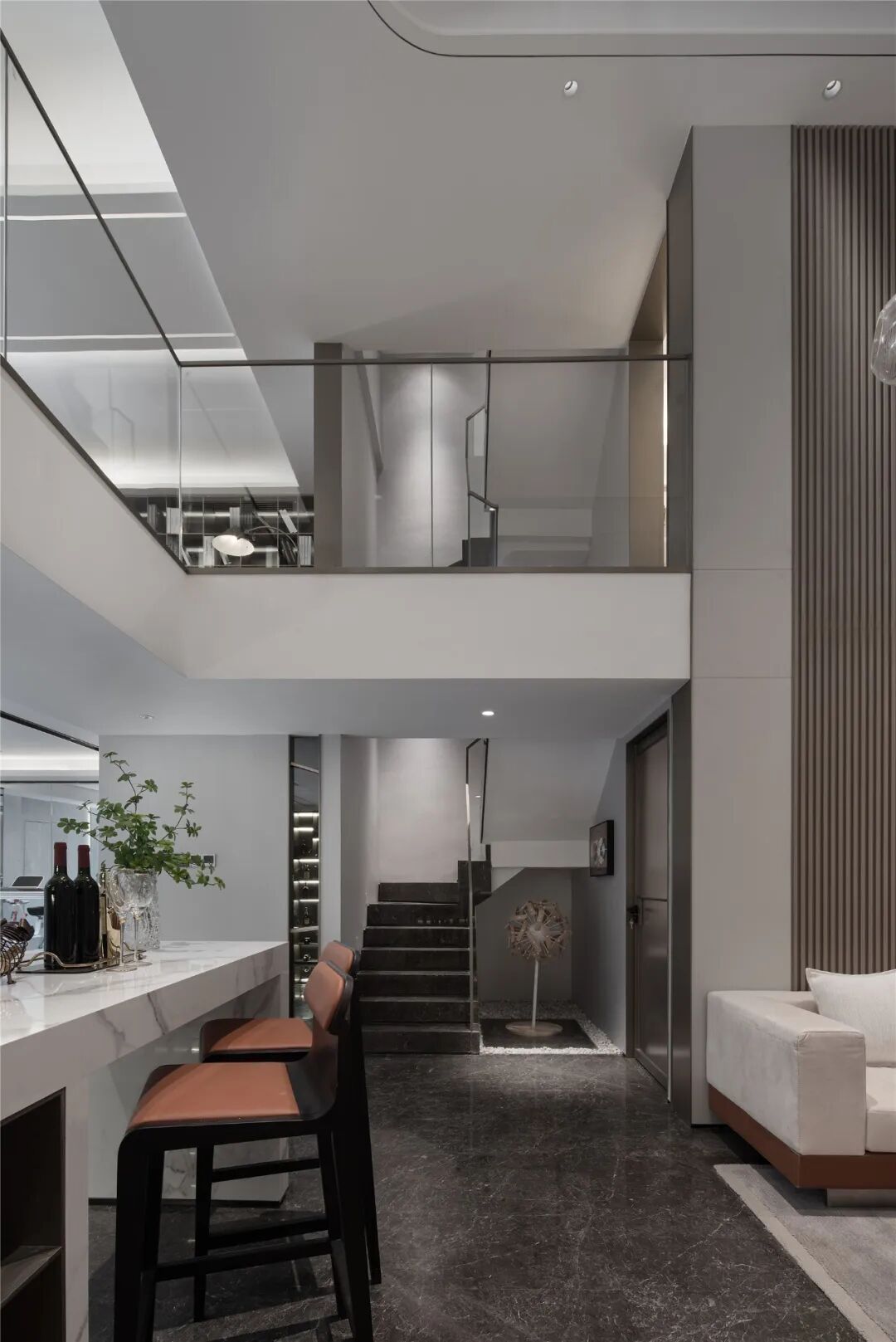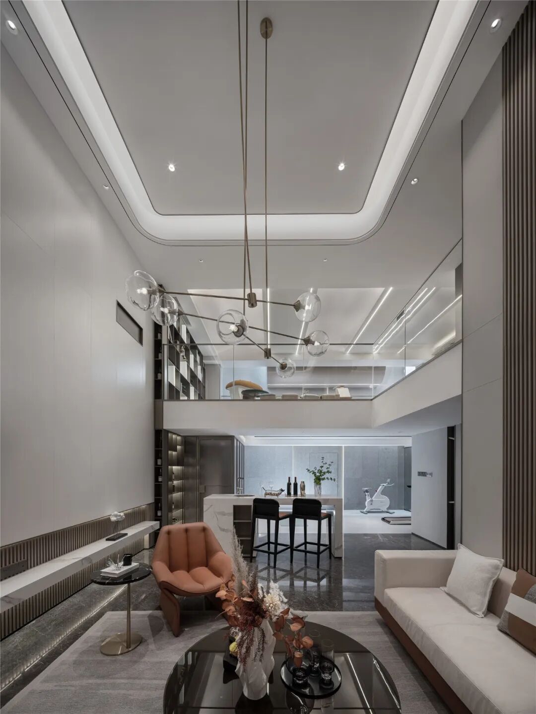 会客厅挑空处理,彰显空间的沉稳大气,删繁就简设计手法,赋予空间更强的包容性。墙面独具秩序美感的木饰面与大面积留白形成拼接对比,简单中散发出高级的几何之美。L型沙发与独立座椅围绕圆形茶几摆放,构筑场所的聚合感,与繁华保持着若即若离的关系,享受生活的悠闲与丰盈。
