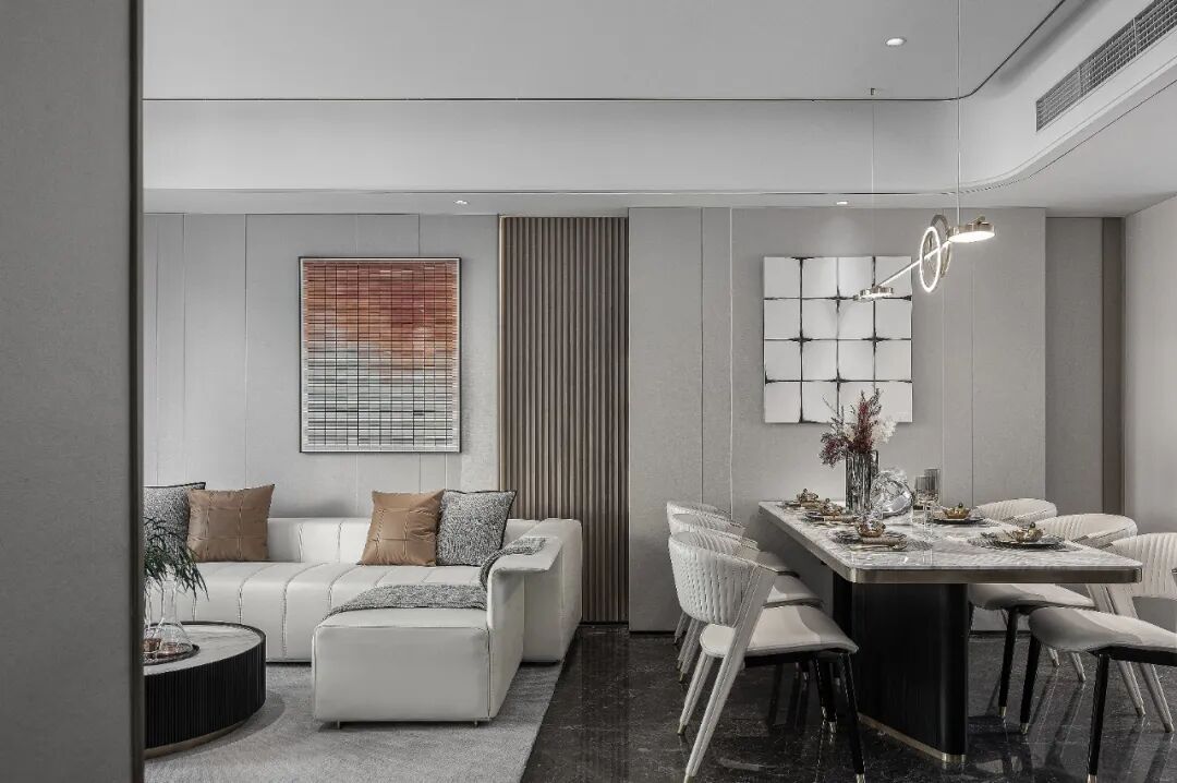 客厅、餐厅、西式厨房一体化设计,空间通透而舒展,相邻空间既可自由互动又彼此独立。皮质、金属、石材,不同的材质肌理达成视觉与触觉的精致和谐,于低调内敛中展现生活的质感与优雅。简约格调的墙面挂画为空间增添一份艺术的气息,同时也为空间注入一份精神内涵。