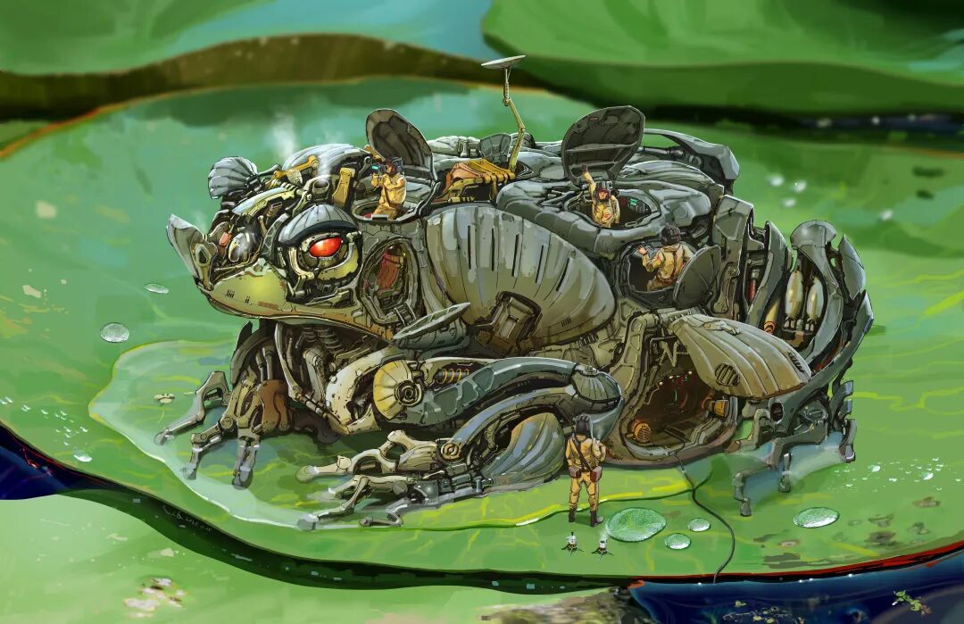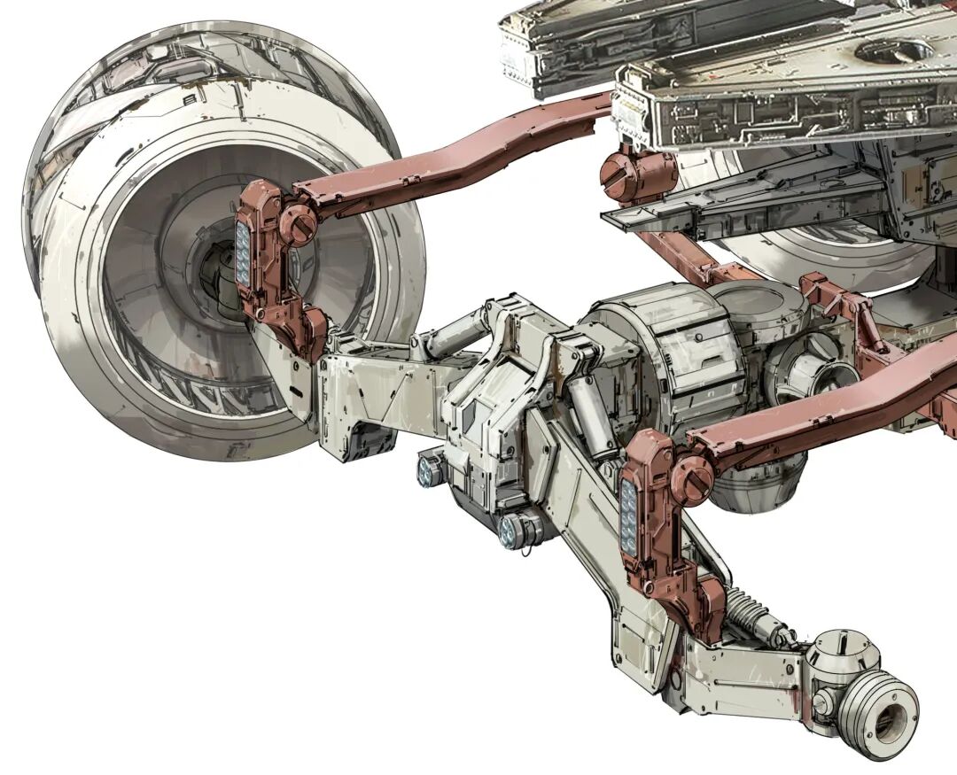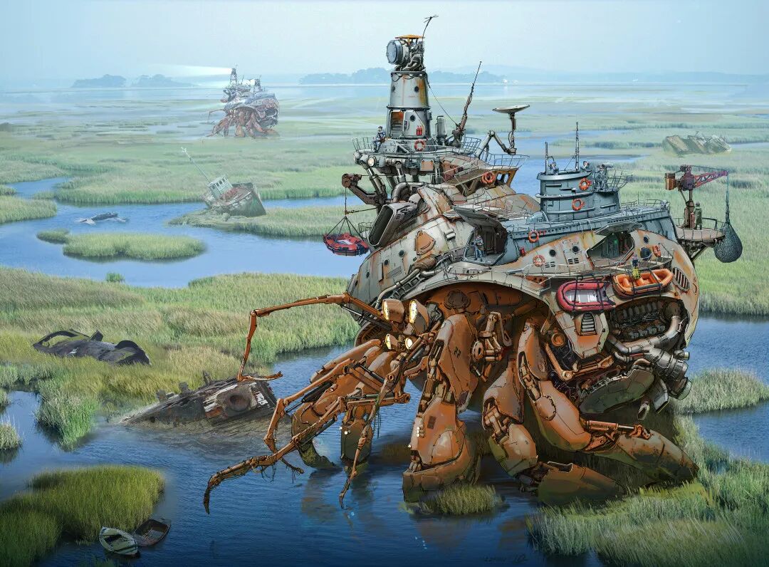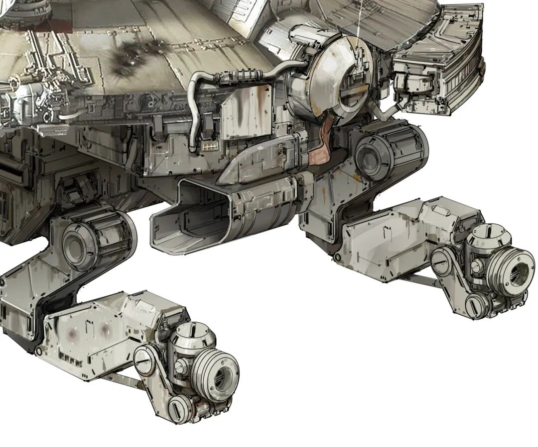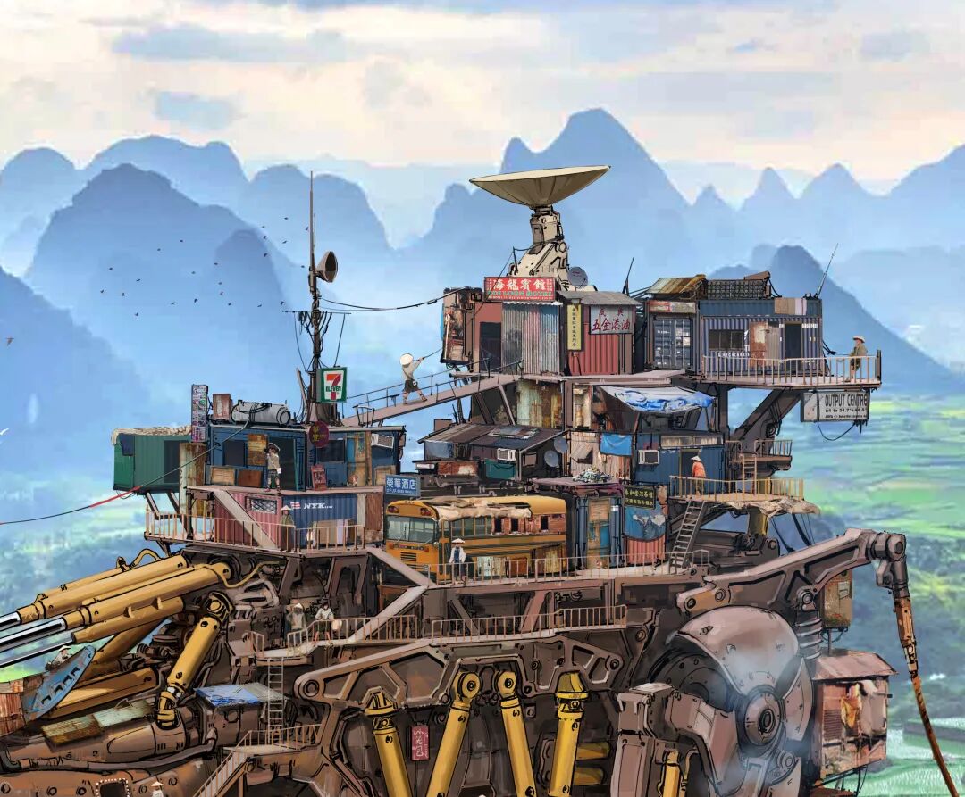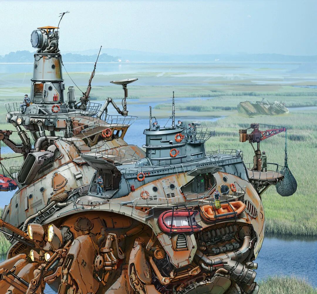 虽然脑洞很大,但他的作品在结构设计上却很合理,而且看起来还兼具一定的功能性,机械感十足。从局部图来看对于细节的刻画也非常细腻,让人惊叹于他扎实的绘画基本功以及对于整体设计的把控。