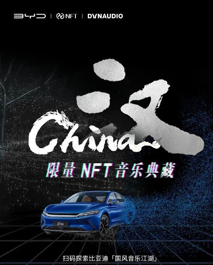 此前,比亚迪携电音制作人徐梦圆与国乐大师方锦龙推出了主题曲《China-汉》,最近品牌将这首纯乐版主题曲打造成限量 NFT 音乐典藏,根据 HiFi 级定制丹拿音响的环绕音效算法进行重新缩混制作,呈现 3D 环绕立体声听觉效果,同时比亚迪联合视觉艺术家 BBGUN 将水墨现代艺术质感与科技像素视觉融合,实现传统艺术与数字艺术的碰撞,带来视听享受。