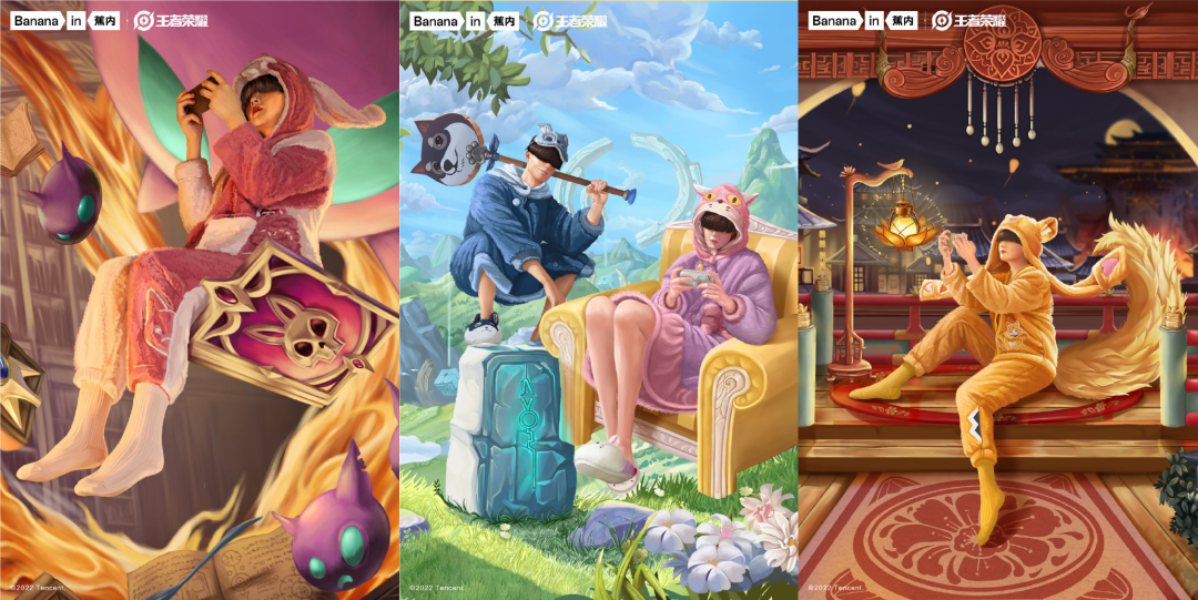 游戏皮肤不只线上的酷炫,还有现世的温暖。王者荣耀六周年之际,伴随一组游戏风十足的个性海报,蕉内与王者推出联名系列。其中不但有人气英雄安琪拉、妲己、大乔孙策情侣皮肤的同款毛绒睡衣、家居服,更有以游戏装备为原型,印有游戏台词的午睡毯和以召唤师技能为灵感的保暖高筒棉袜。蕉内以另类现实皮肤的方式为玩家们在寒冷冬日送上温暖,峡谷内外都能「蕉你放松满血进攻」。