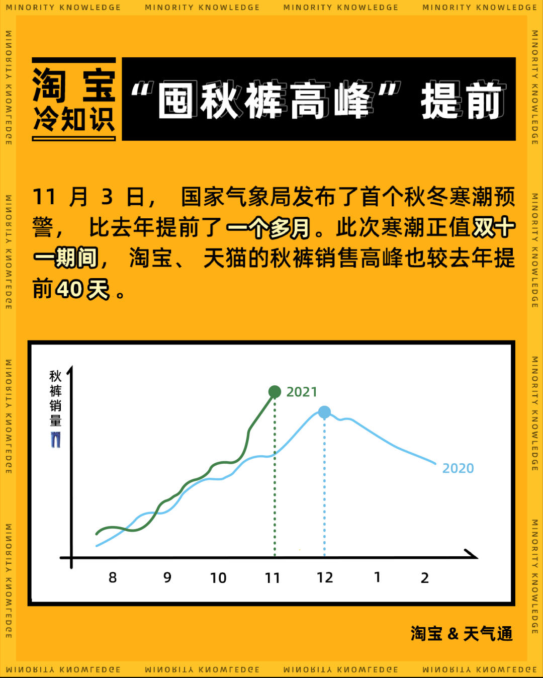 近日,淘宝联合天气通发布新一期《气象经济学冷知识》。结合天气通的气象分析和淘宝相关店铺调研结果,双11期间,淘宝、天猫上的秋裤销售高峰较去年提前40天。这和此前国家气象局发布的首个秋冬寒潮预警相吻合。