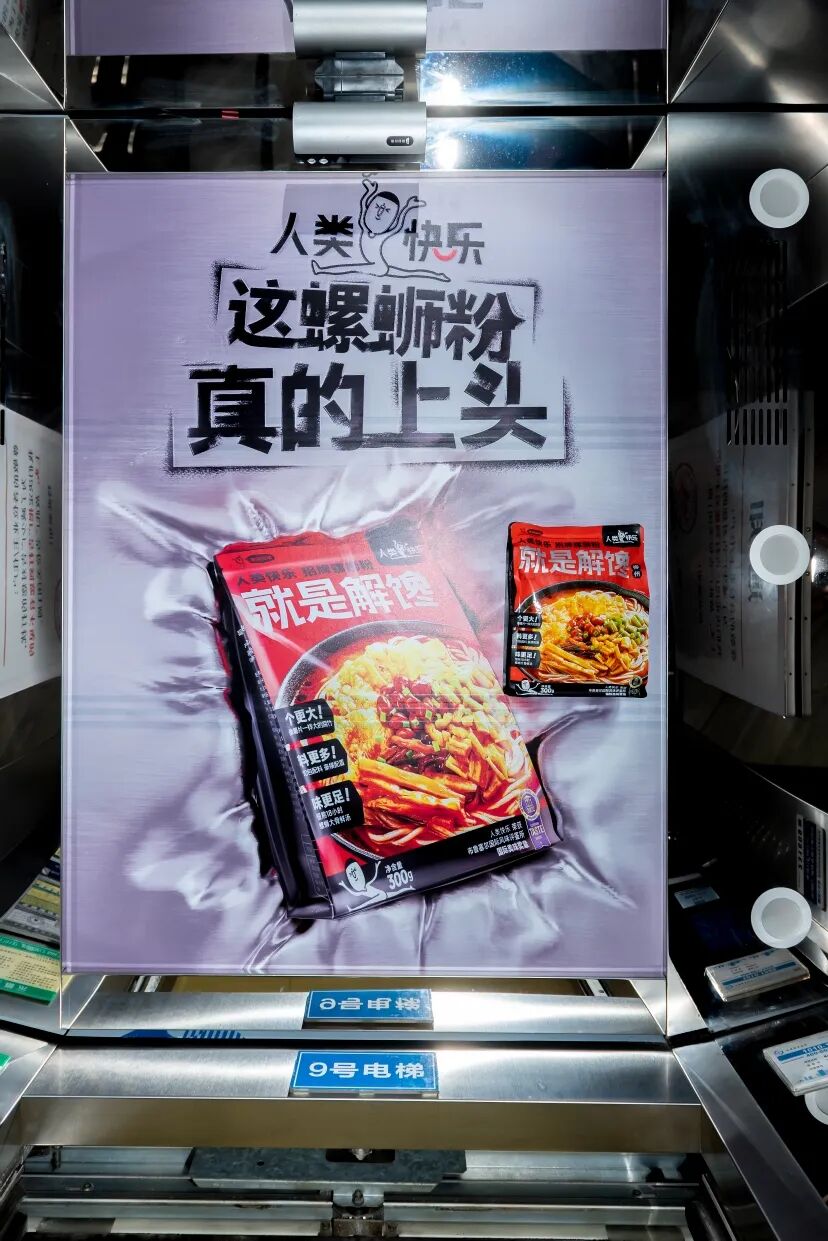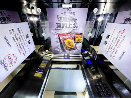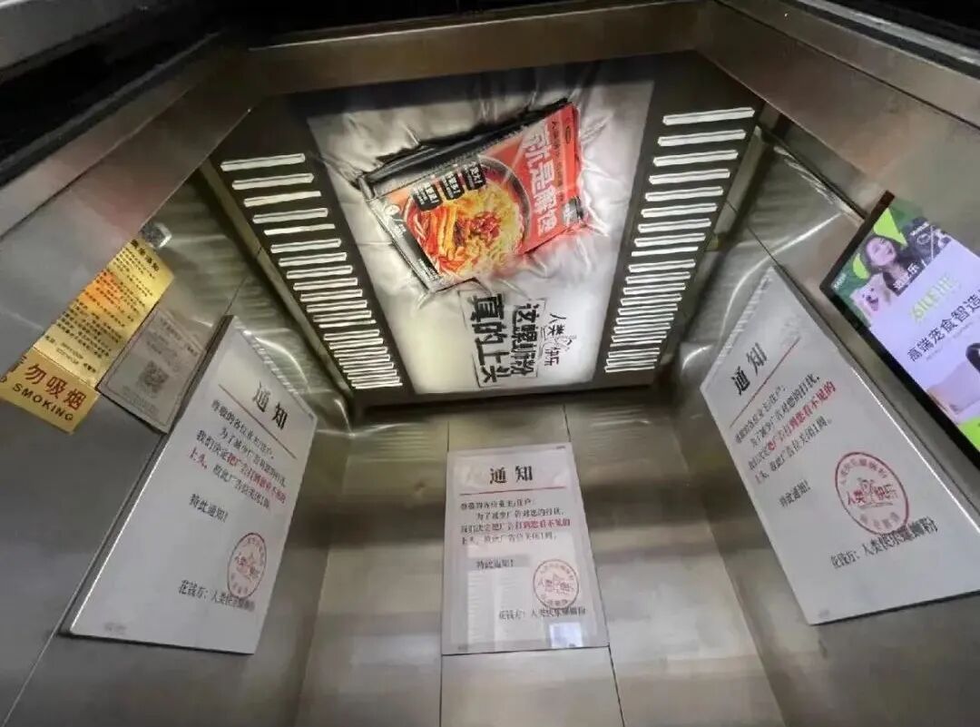 广告方直接把螺蛳粉印在电梯天花板上