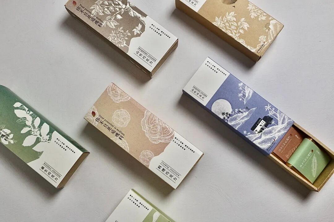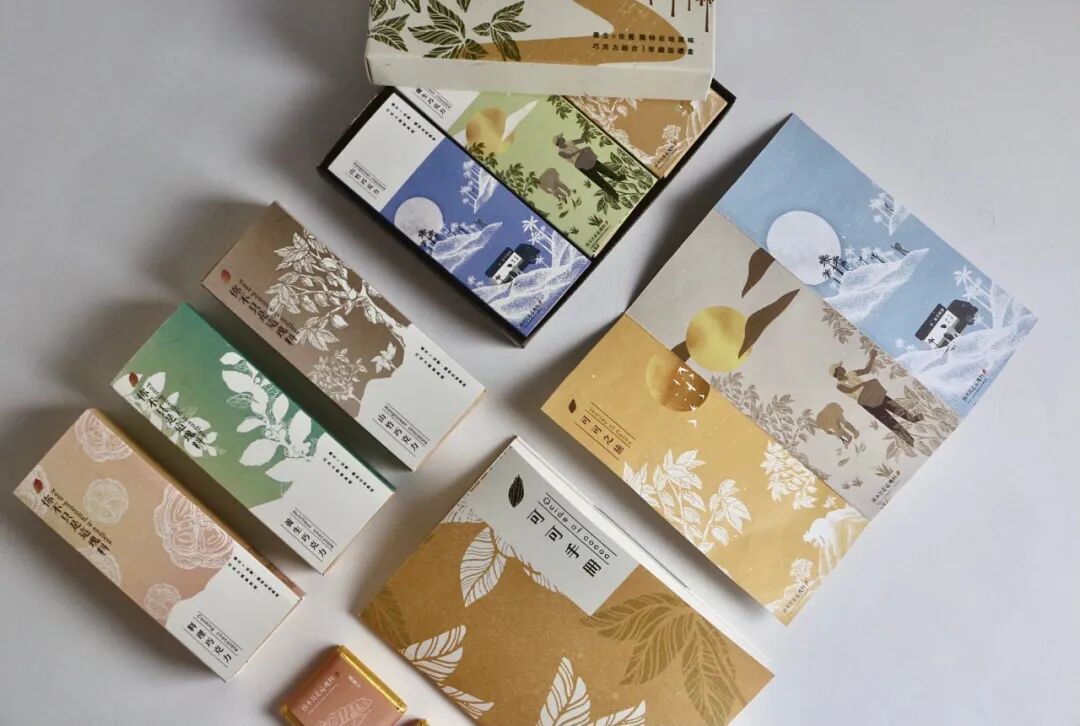 用叙事手法的插画传达前身与现在的可可豆故事,并搭配不同口味的各别小包装抽屉盒。