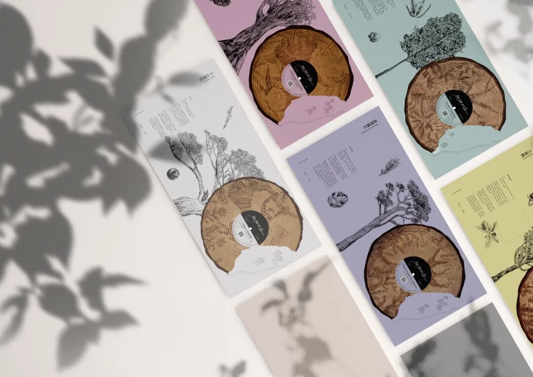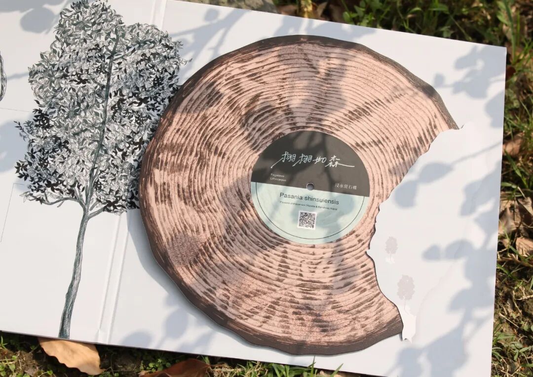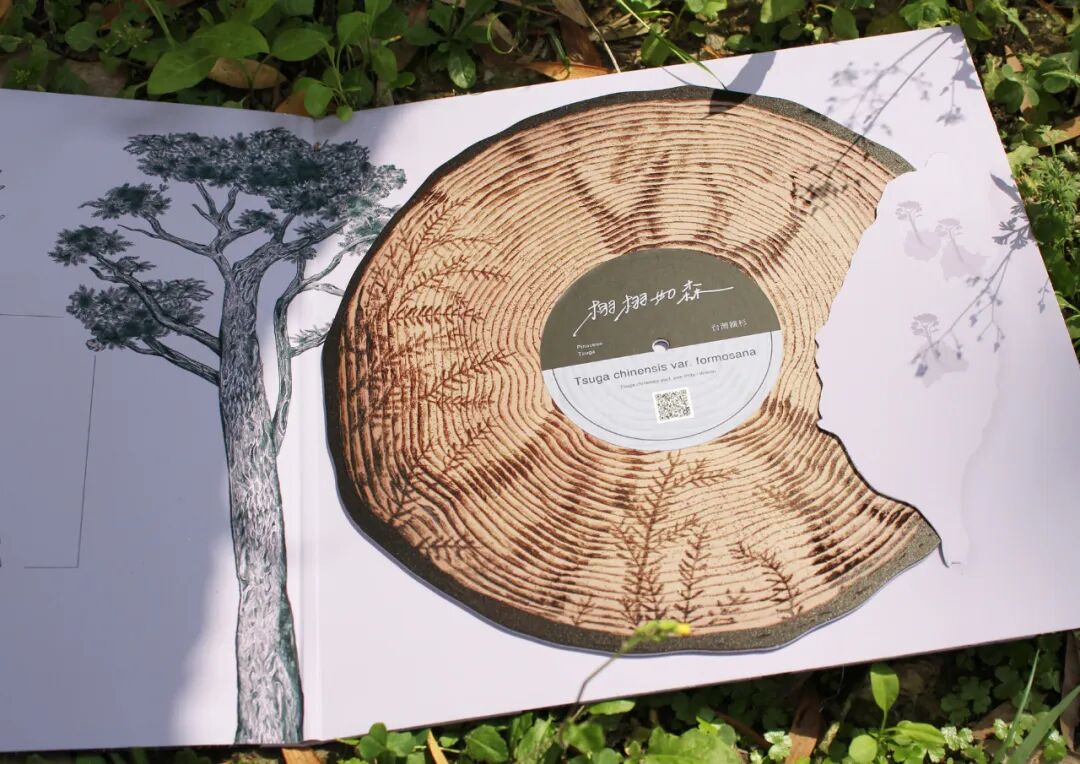 整体设计中我们收录了树木生长环境的声音,并以图像加以记录了树木的生长环境,让人们可以了解树木。在包装上,我们使用黑胶造型的刊物呈现,制作成有声书,根据不同的树种画出其周遭环境。
