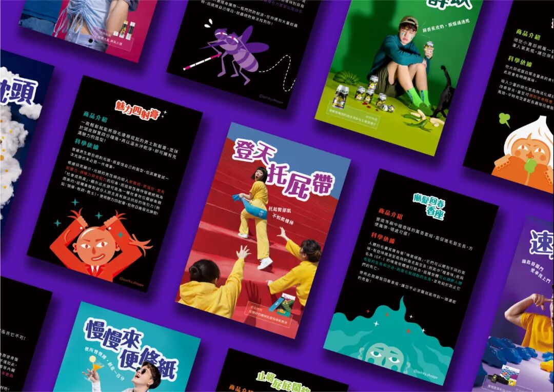 以鲜艳对比色为主色调,与活泼的主题相呼应,同时吸引观者目光、增加话题性。插图采用具有搞怪感的色块风格,传递幽默有趣的视觉感受。12项顽逆商品,搭配附有科学依据的介绍小卡,快来顽逆小卖部挖掘日常中更多可能性吧!