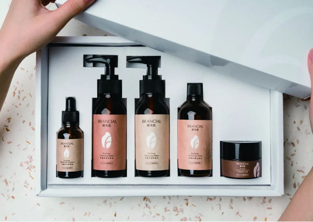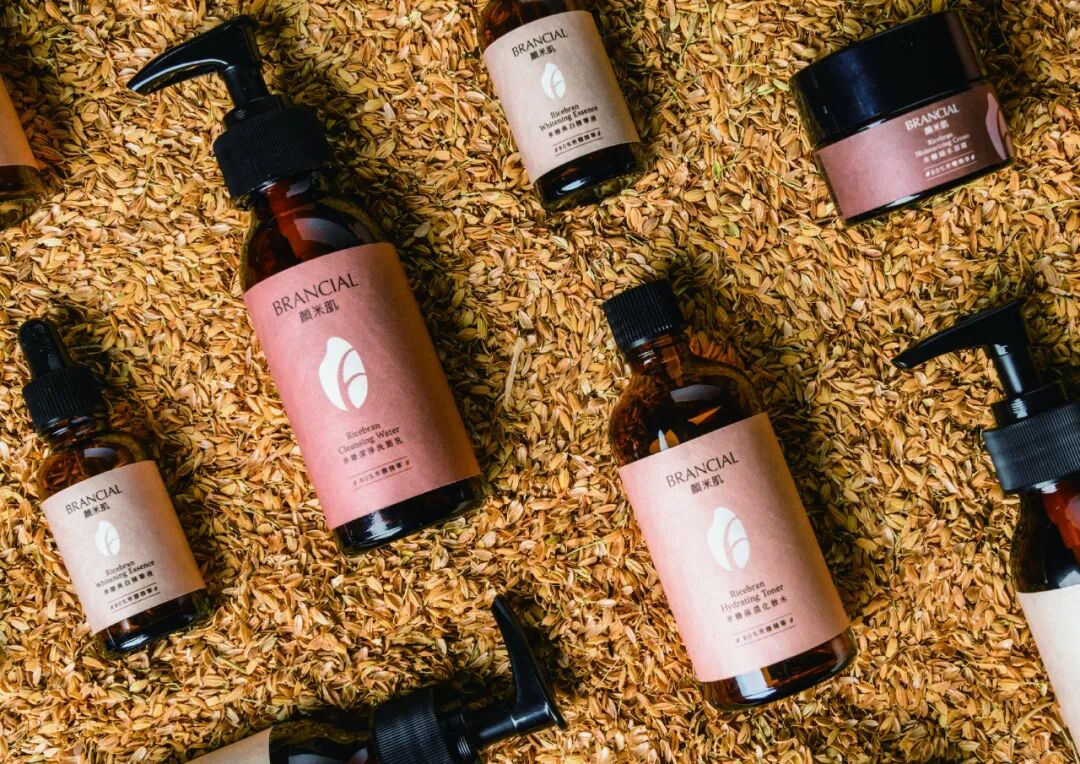 透过由稻谷所制的纸材与包装外盒对比,表现保养品使用前后的变化,瓶身使用不同颜色及纹路的贴纸呈现米糠的朴实多样。强调米糠的天然无污染,让热爱台湾这块土地的人们能关注到这个品牌。