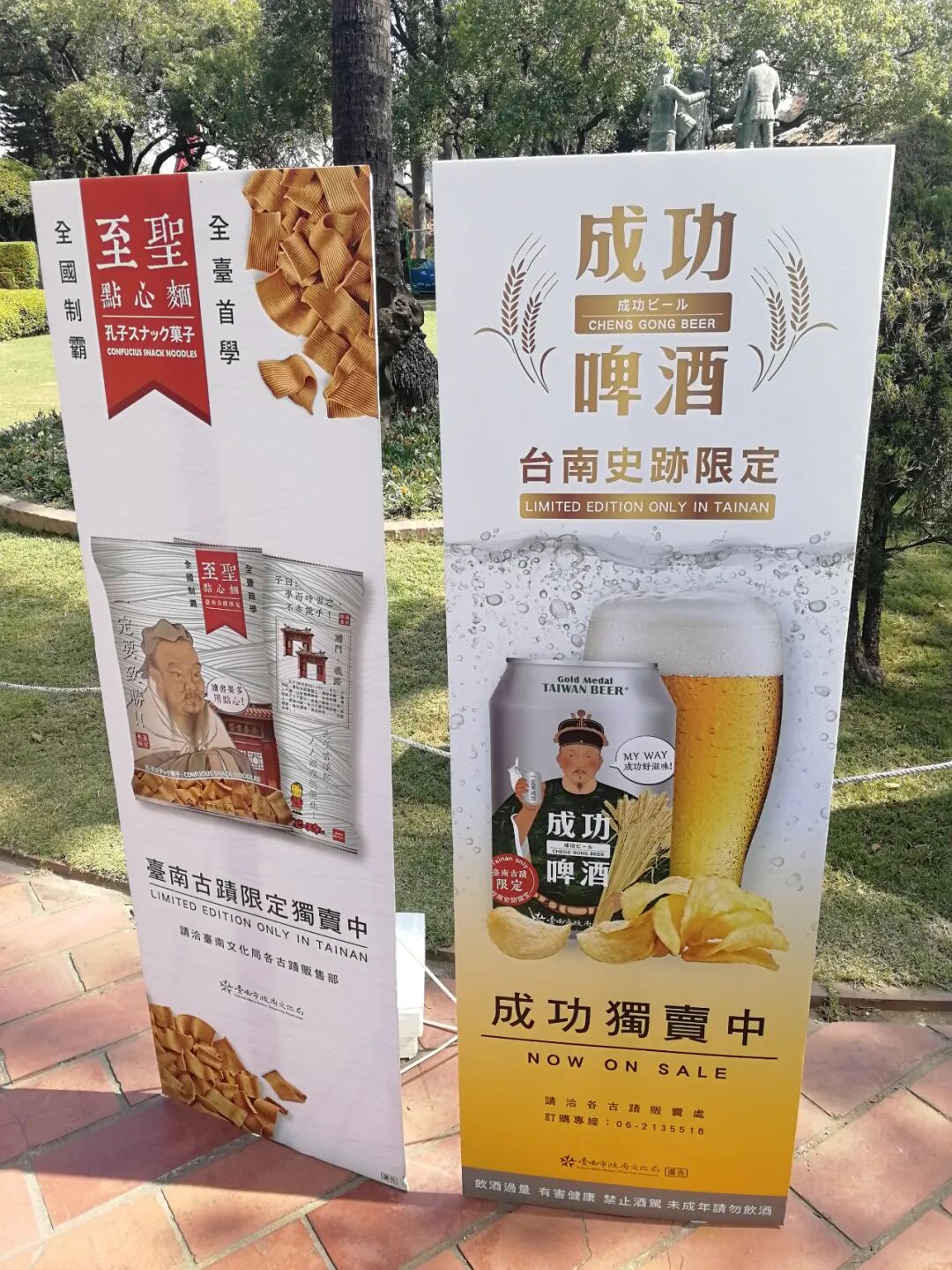 只见道路旁竖着两张易拉宝,展示两种极具特色的“台南史迹限定”——印着手持啤酒罐的郑成功像,配上对话框“成功好滋味”的成功啤酒;