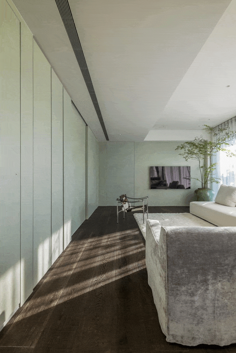 以釉色匀墙,地面便想以水墨衬出场景重量,因为若以常见橡木色衬底,重心不足会使秘色显得飘忽犹疑,反而以黑棕色为地坪,就如水墨画中奠定层次的浓墨,在大尺度画纸上稳住各个元素的定位。且相较于浅色木质,夕阳映入室内时,黑棕色地面更能衬出明暗节奏,在沈定的轴线上悠悠晾着光影。