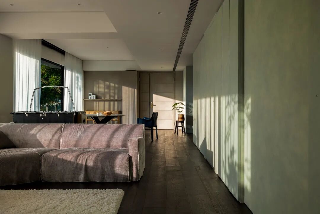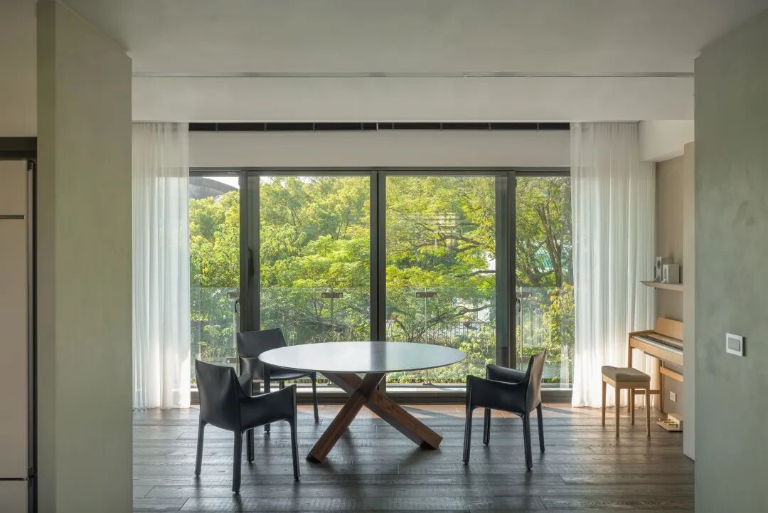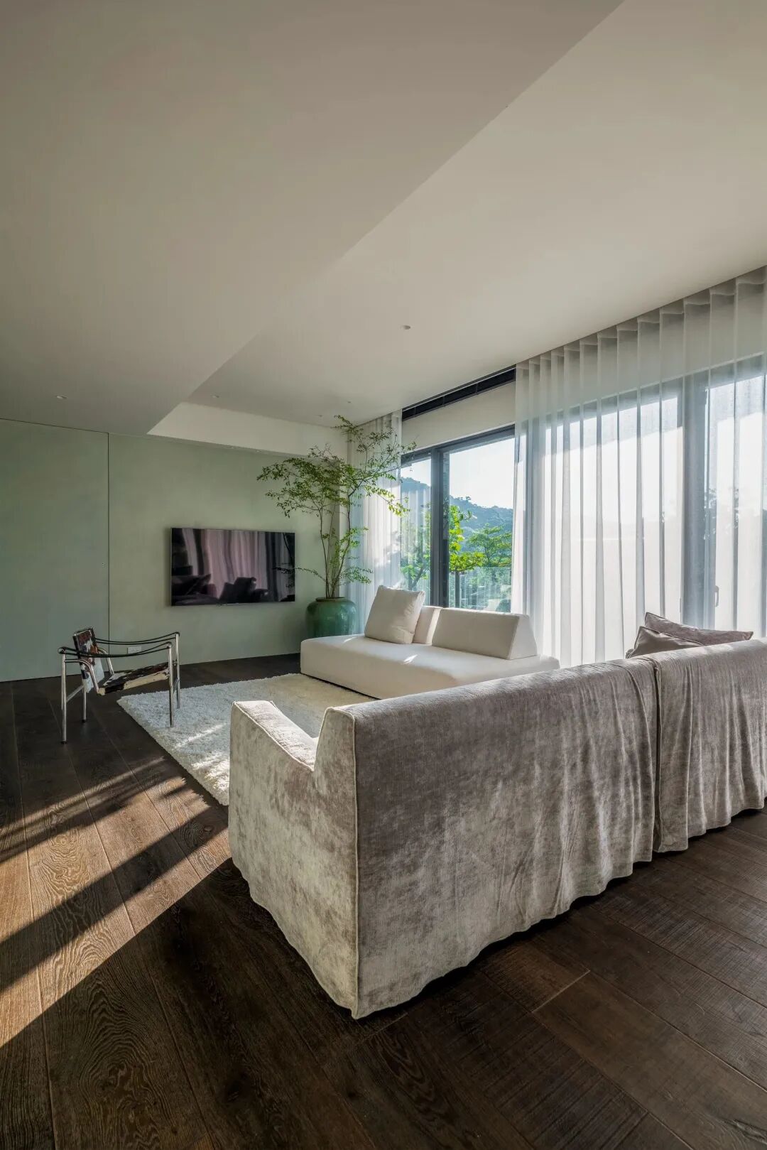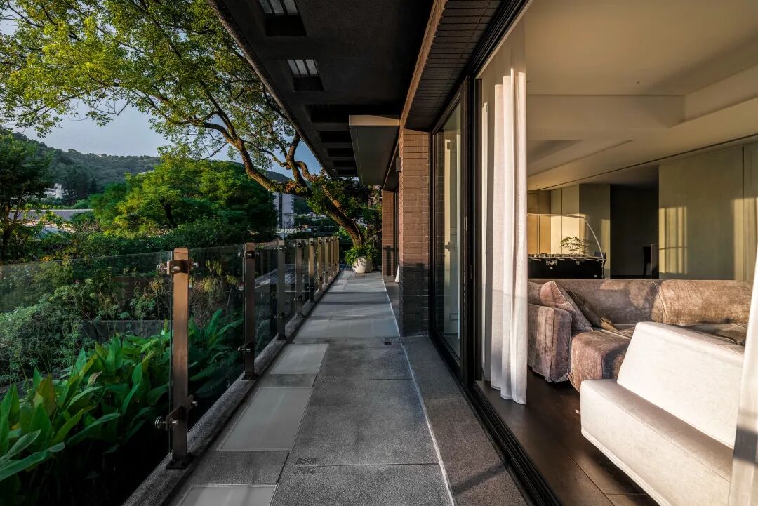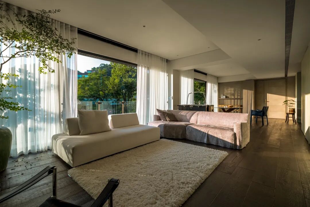 为强调窗景和动线流畅,设计师拉大落地窗跨距,规划格局也避免墙体垂直接触、切断窗的连贯性,带状露台也在外形成另一串连起居的小径,微风能随生活在此间游走。
