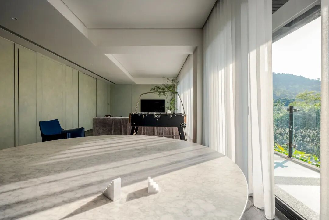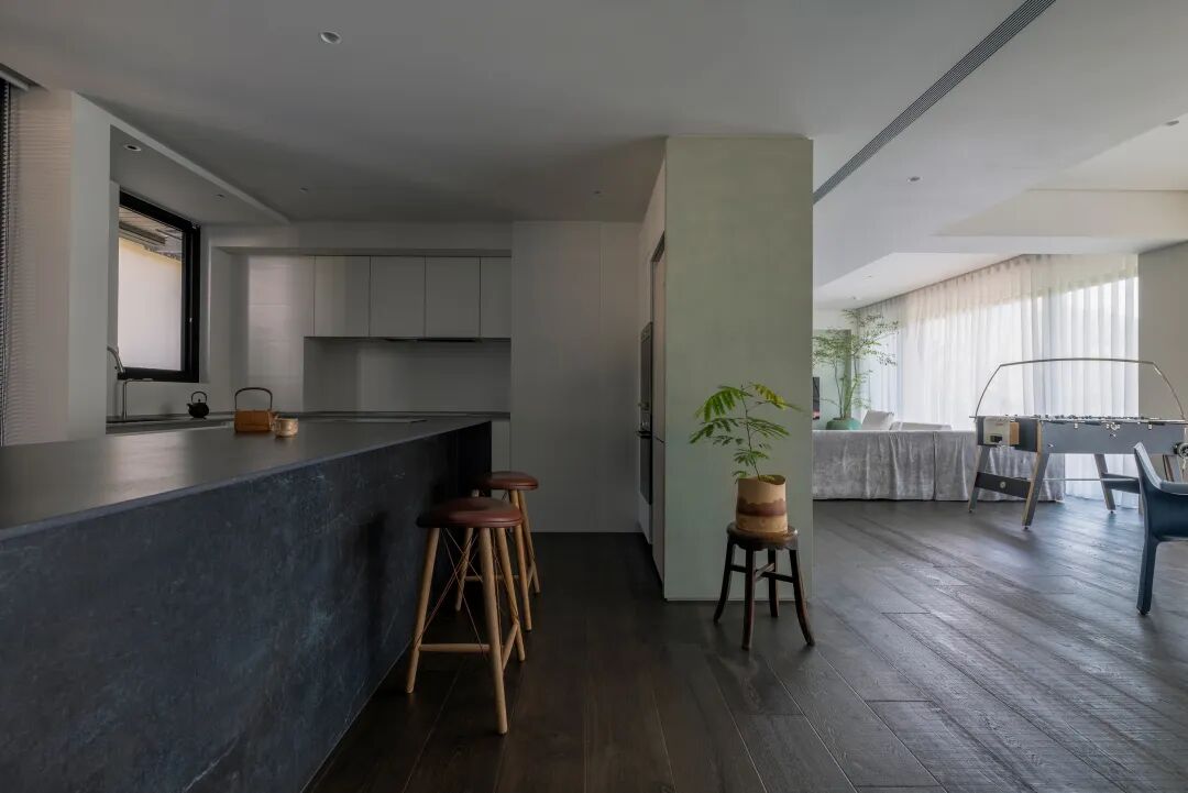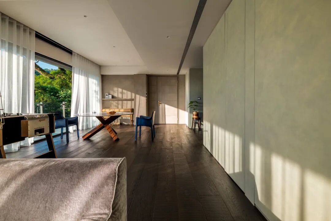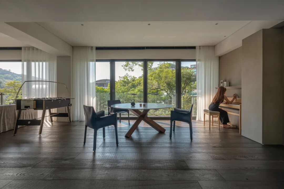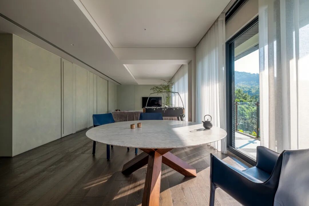 为强调窗景和动线流畅,设计师拉大落地窗跨距,规划格局也避免墙体垂直接触、切断窗的连贯性,带状露台也在外形成另一串连起居的小径,微风能随生活在此间游走。