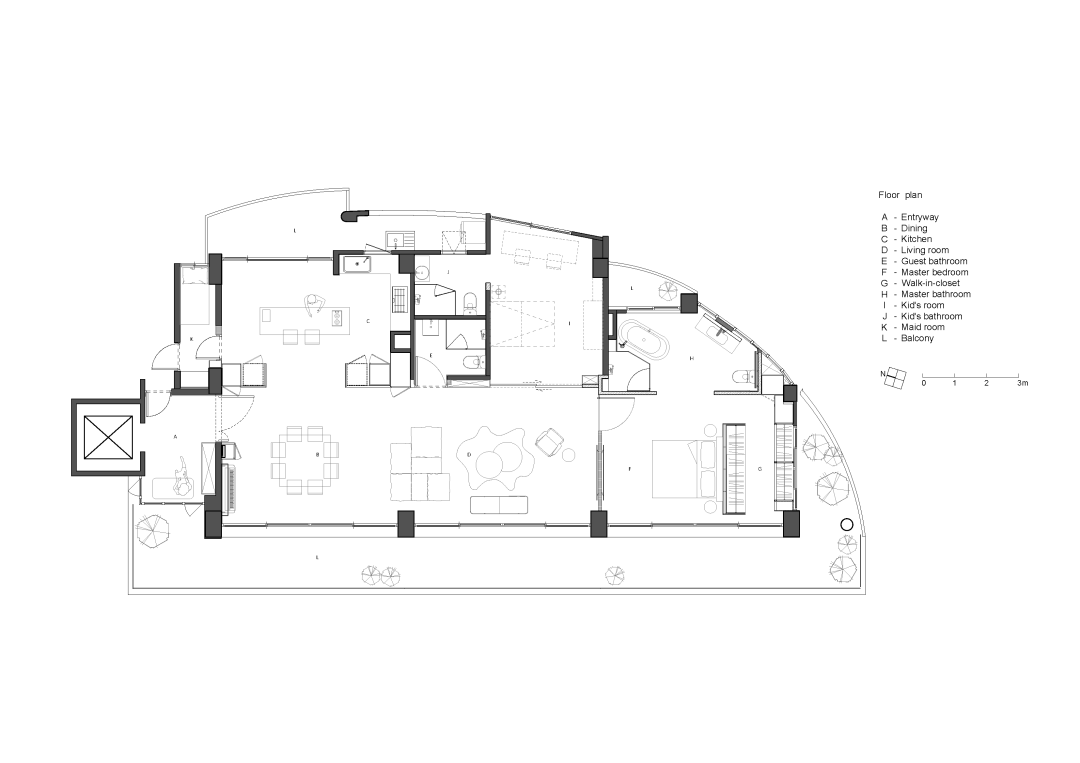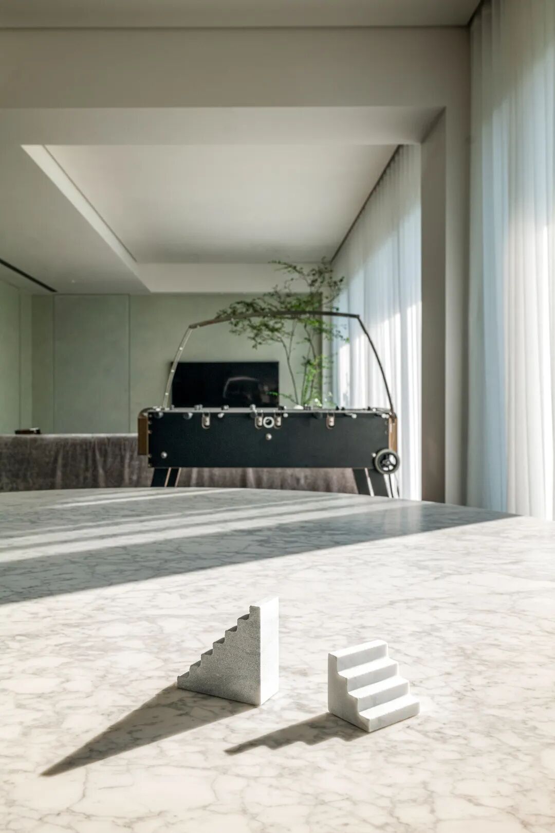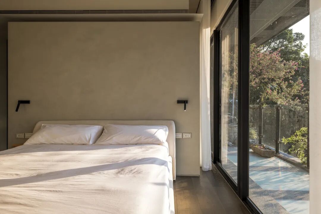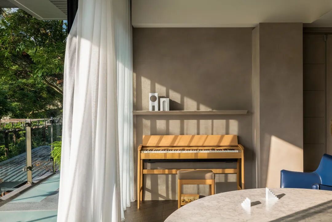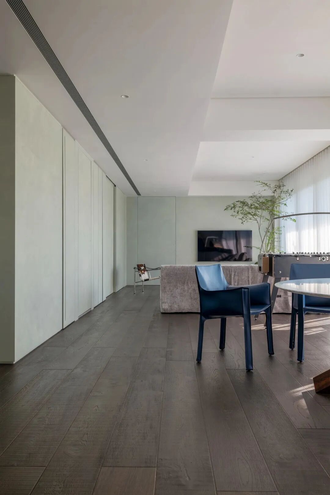 为强调窗景和动线流畅,设计师拉大落地窗跨距,规划格局也避免墙体垂直接触、切断窗的连贯性,带状露台也在外形成另一串连起居的小径,微风能随生活在此间游走。
