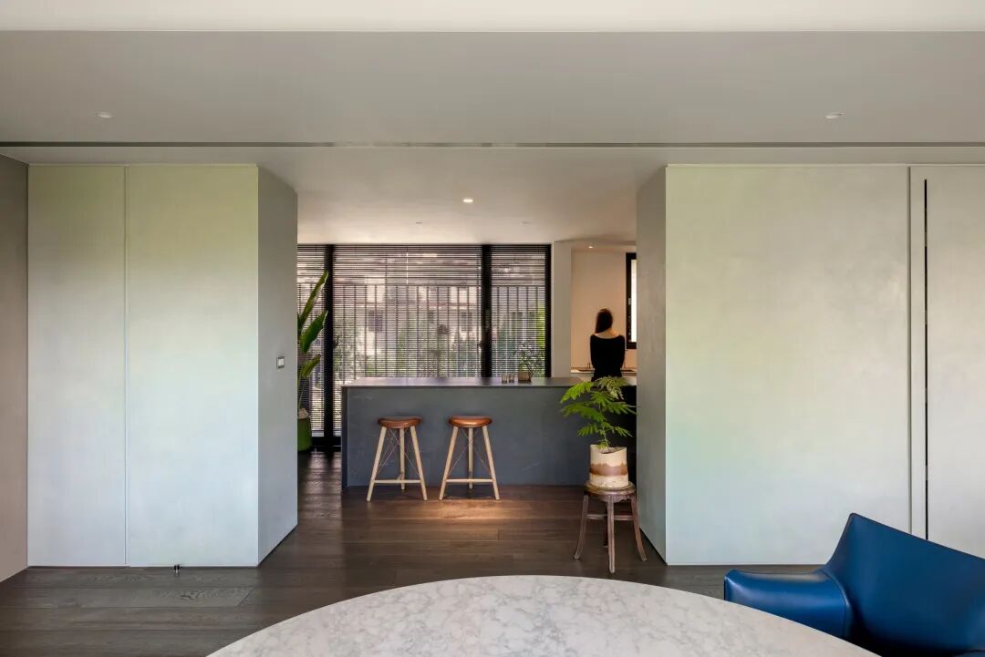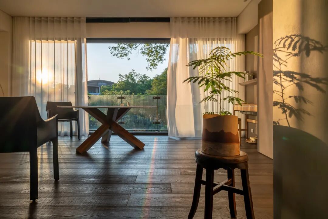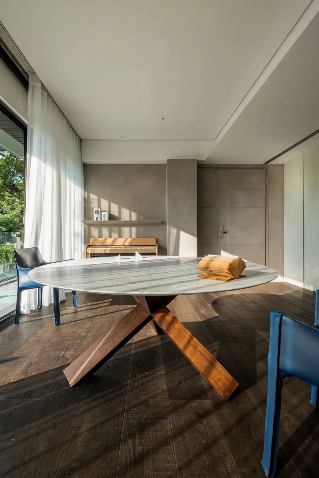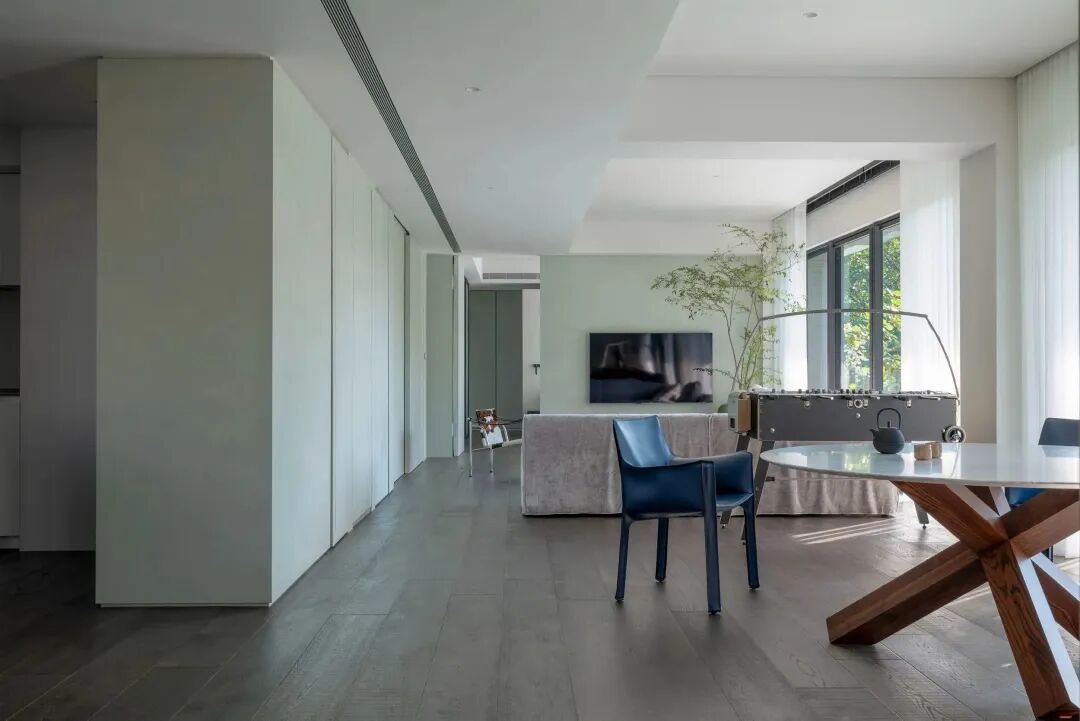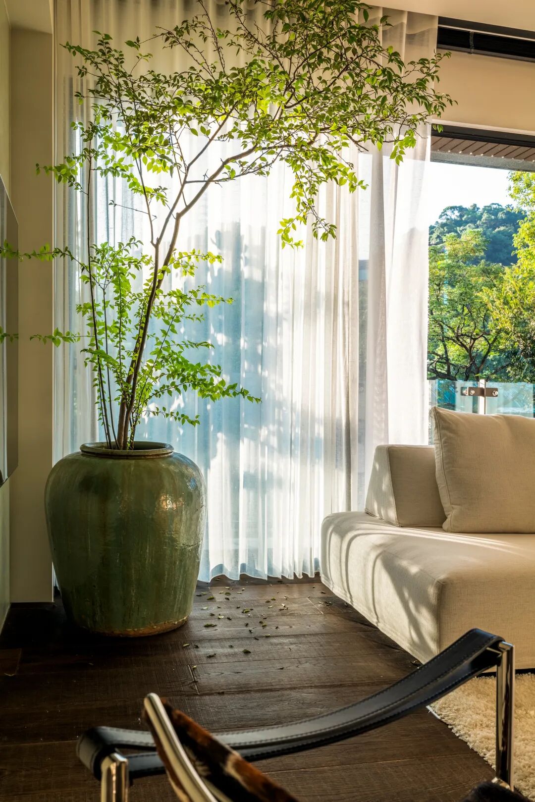 即便有隔间,屋里景色仍是流动的,如玉石的静谧与光润都是一气呵成。当风自树梢窜入拨动映在各处绿影,那是生活倚傍自然的况味,下一刻风又静下,山在画外。