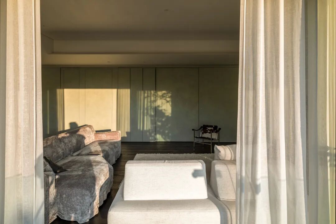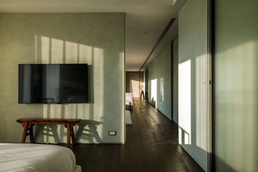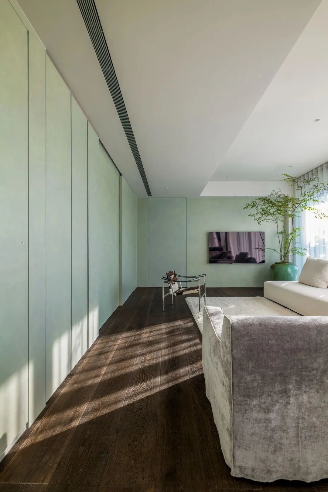 而漆料矿物粒子折射日光的强弱变化,使早晨清丽如未散的薄雾,翠色漫着一层灰白;当夕阳直射入室,色温使墙转为带着光泽的碧绿;入夜开启照明时,白中带绿的层次似暖玉,随视角变换色阶,如山色在有与没有之间最美。