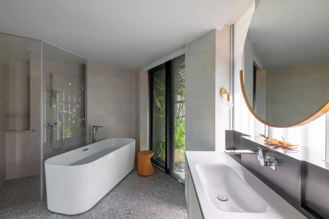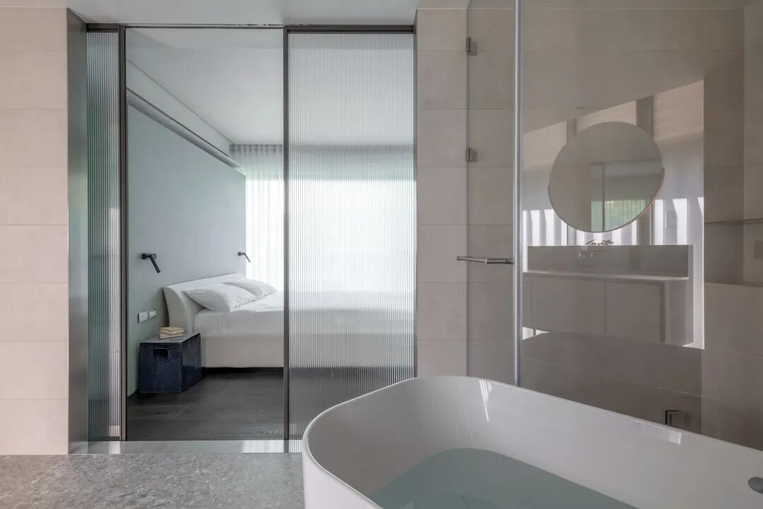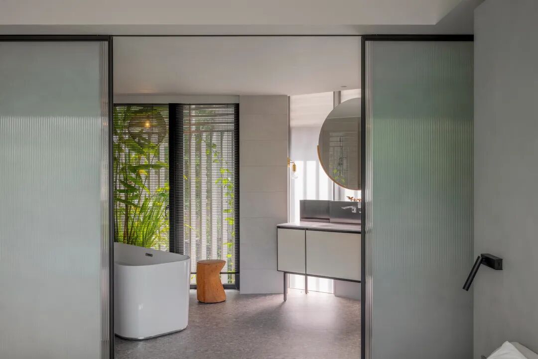主卧床头与更衣室隔间墙变与窗脱开距离,绿意和晨昏光景能延续、穿梭。主卧浴室同样不以隔墙柜体阻断采光,但基于隐私更换为雕刻玻璃,梳洗之余仍可感受个人与自然相连。