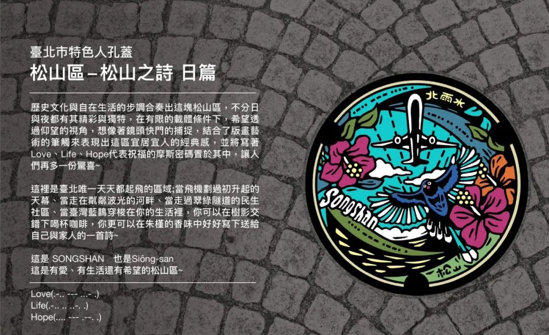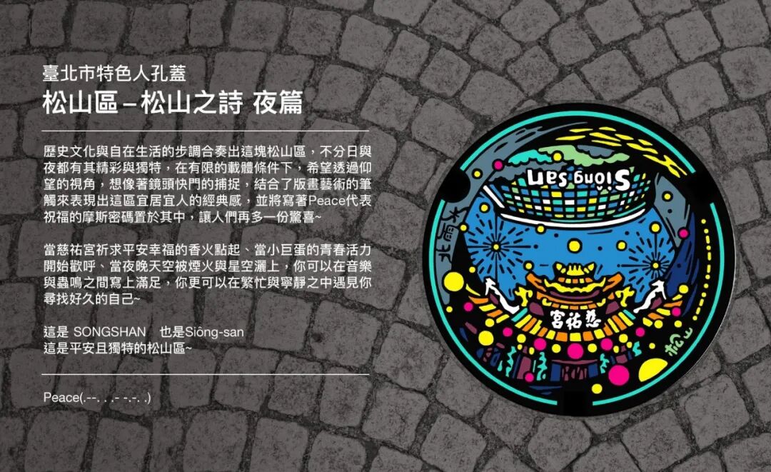 马赛Kyo设计师,选择以松山区的「历史文化」与「生活样貌」为主题进行创作,将松山区的日与夜透过镜头快门捕捉,并以版画的方式呈现,创作出两款不同特色的松山区人孔盖—「松山之诗日篇」与「松山之诗夜篇」。