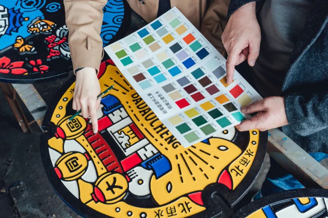 台北盖水表示,雨水孔盖的制造,从设计、模型、铁鑄再到上色,是令人期待也困难的阶段。以平面设计来说PANTONE色库总共超过15,000+色,但是在孔盖制程条件下仅能使用100+色;在配色难度和调色难度都增加许多的状况下,设计师团队与工厂多次沟通密切配合,才能完成作品;而在路面上人们所看到的特色雨水孔盖,皆是由上色师全手工ㄧㄧ填色,可说是一项耗时耗力的工程。